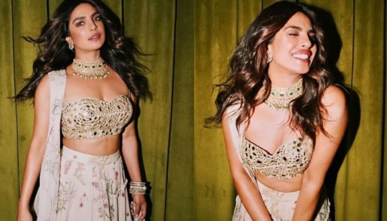 মিরর ওয়ার্ক চোলিতে উন্মুক্ত বক্ষ-বিভাজিকার নেশায় আগুন ধরিয়েছেন পিগি চপস (Priyanka Chopra)। লেহেঙ্গার সঙ্গে মানানসই হিরের চোকার নেকপিস , কানের দুলে, হাতে চুড়ি পরেছেন প্রিয়ঙ্কা। খোলা চুলে প্রিয়ঙ্কার দেশি লুক দেখে চোখ ফেরাতে পারছেন না।