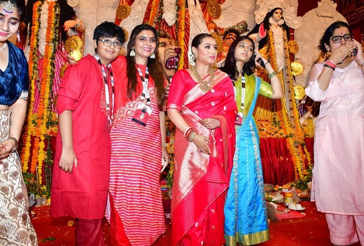বাঙালির প্রিয় দুর্গাপুজোয় মজেছে আপামর বাঙালি। তেমনই মুম্বইয়ের মুখার্জি বাড়িতেও ধুমধাম করে শুরু হয়ে গেছে দুর্গাপুজো।  মুম্বইয়ের রানি মুখোপাধ্যায়ের বাড়ির পুজোয় জমায়েত হয়েছেন তারকারা। এই দুর্গাপুজোর দিনগুলিতে পোশাক হিসেব শাড়ি বেছে নেন রানি মুখোপাধ্যায় বিভিন্ন ডিজাইনের চোখধাঁধানো শাড়িতে নজর কাড়েন  অভিনেত্রী রানি ও কাজল। লাল টকটকে শাড়িতে পুজোর মূল আকর্ষণ কেড়ে নিয়েছেন রানি। ট্র্যাডিশনাল শাড়িতে লাস্যময়ী রানিকে দেখে চোখ ফেরাতে পারবেন না আপনি।