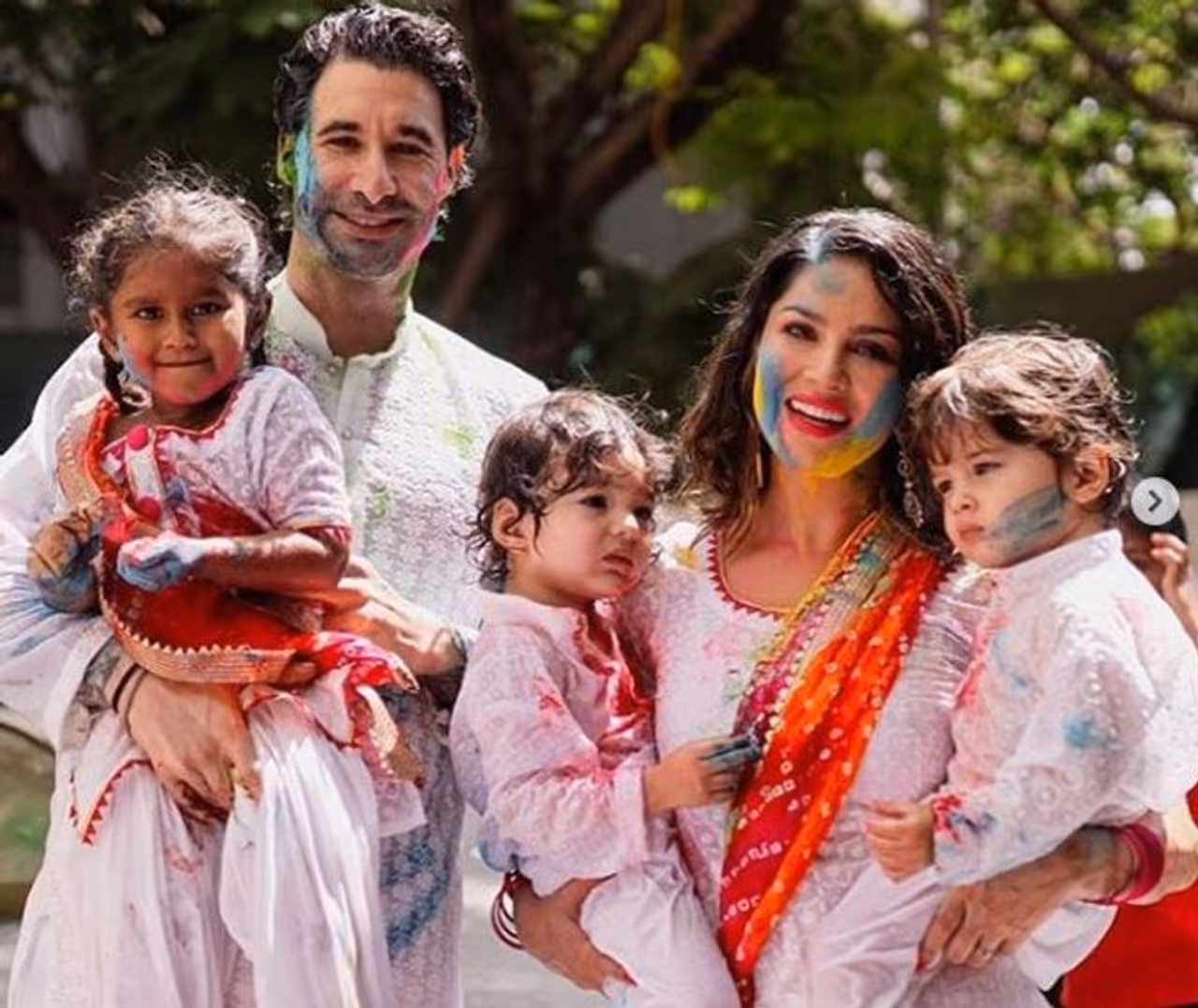 রং খেলে মেয়েকে নিয়ে ও বরকে নিয়ে একাধিক পোজ দিলেন সানি।