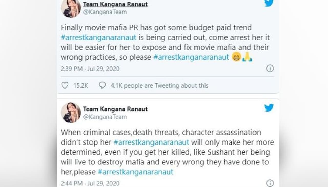কঙ্গনার টুইটার টিম লেখে, "অবশেষে মুভি মাফিয়ার পিআর টিম বাজেট পেড ট্রেন্ড শুরু করেছে। কঙ্গনাকে গ্রেফতার করা হোক। ওনার পক্ষেও সুবিধাই হবে মুভি মাফিয়াদের মুখোশ টেনে খোলা।"