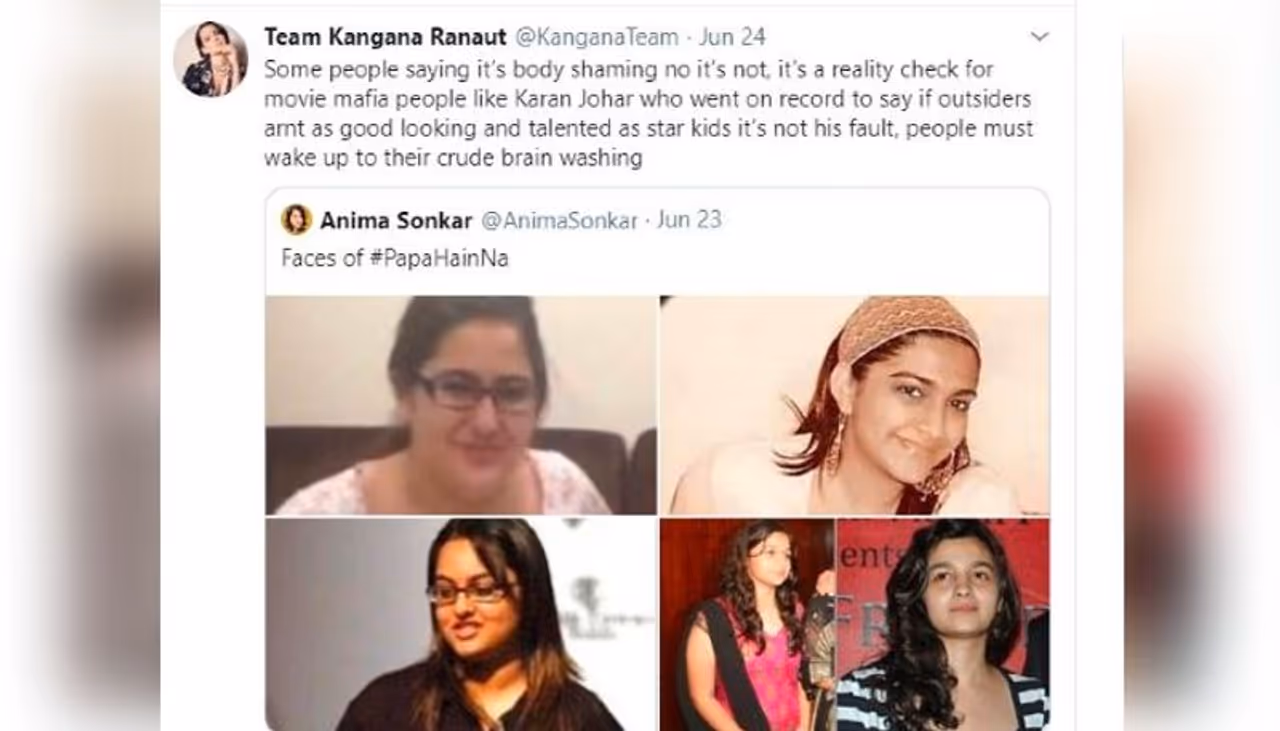 সারা আলি খান এক সময় রীতিমত ওভারওয়েট ছিলেন। সেই বারতি মেদ ঝড়িয়ে আজ তিনি অভিনেত্রী। একই অবস্থা ছিল আলিয়া ভাট, সোনাক্ষী সিনহা এবং সোনমের। সেই ছবিগুলিই শেয়ার করেছেন কঙ্গণা।
