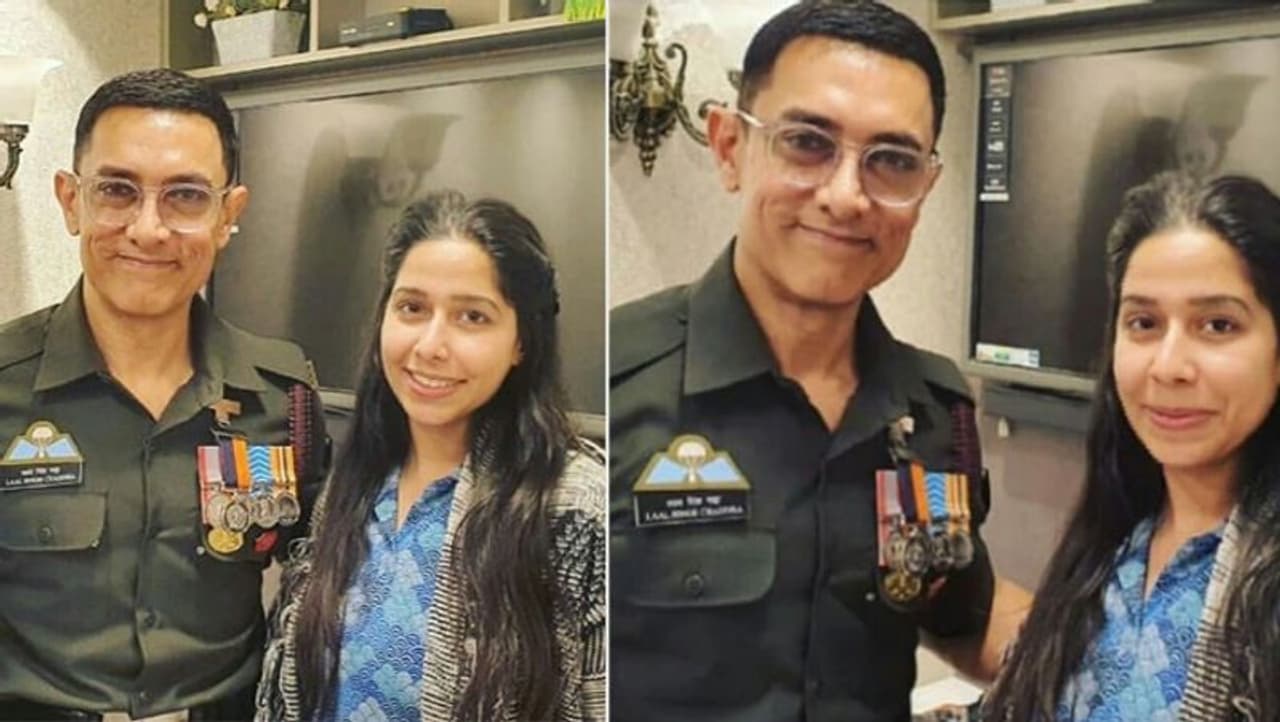 আর্মি অফিসারের ইউনিফর্ম, সাদা ট্রান্সপারেন্ট চশমা, ছোট ছোট করে কাটা চুল, ক্লিন শেভড। এমনই লুকে ধরা দিলেন আমির। পাশে দাঁড়িয়ে সেই ভক্ত।