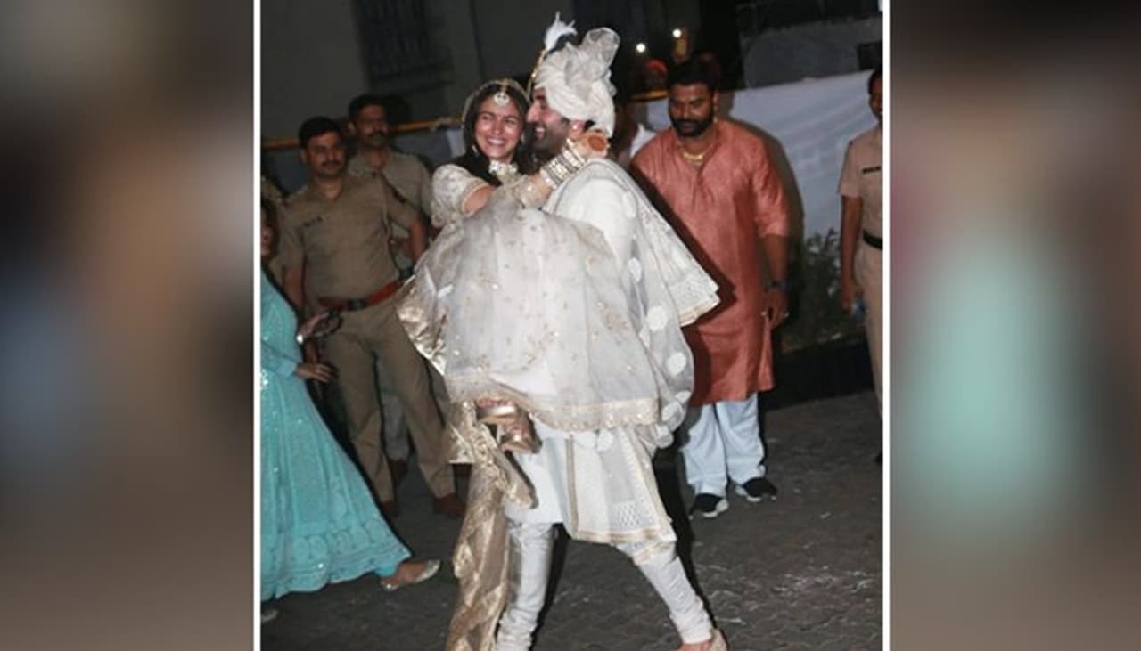 জীবনের এই বিশেষ দিনে ম্যাচিং পোশাক পরেছিলেন এই তারকা দম্পতি। আলিয়ার পরনে ছিল সাদা শাড়ি। তার উপর গোল্ডেন কাজ করা ছিল। আর রণবীরের পরনে ছিল সাদা পাঞ্জাবি আর মাথায় পাগড়ি। বিয়ের পরই একসঙ্গে পাপারাৎজিদের ক্যামেরার সামনে আসেন তাঁরা। আর সেখানেই রণবীর কোলে তুলে নেন নববধূকে।
