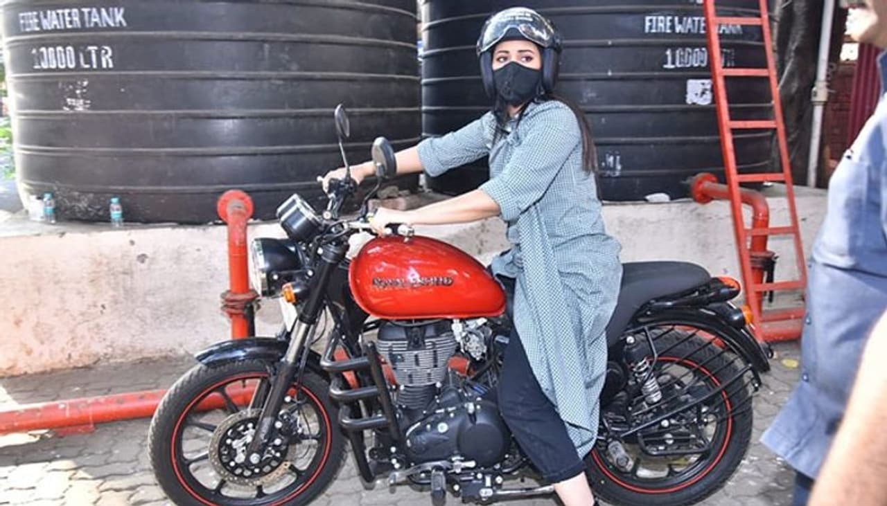 মুম্বইয়ের ব্যস্ত রাস্তায় লাল বুলেটে পুরো রকস্টার লুকে ধরা দিয়েছেন অভিনেত্রী।