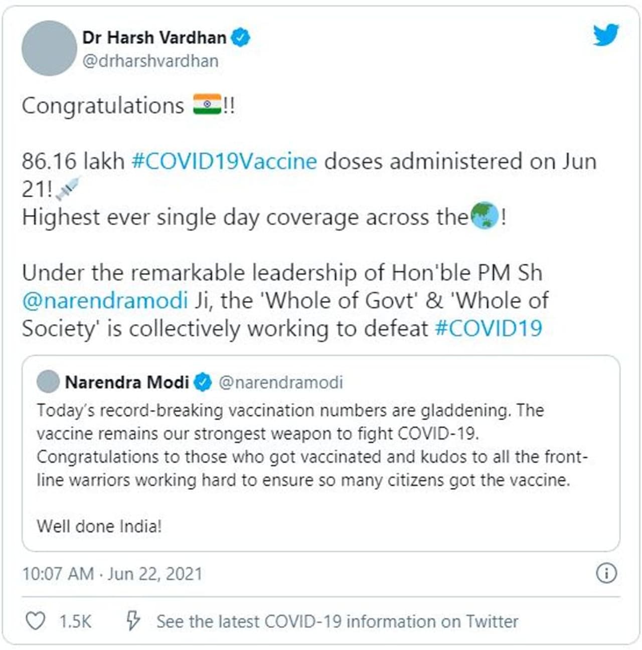 স্বাস্থ্যমন্ত্রী হর্ষ বর্ধন, সোমবার রাতে টুইট করে দাবি করেন, এককদিনে করোনা টিকাদানের ক্ষেত্রে এটা বিশ্বরেকর্ড। প্রধানমন্ত্রীও এই নিয়ে তাঁর আহ্লাদ প্রকাশ করেছিলেন। ৯ জুনের 'নেচার' জার্নাল অবশ্য জানিয়েছিল, চিনে এক সপ্তাহেরও বেশি সময় ধরে প্রতিদিন দুই কোট করে নাগরিককে টিকা দেওয়া হয়েছে। তাই এটাকে বিশ্বরেকর্ড বলা যাচ্ছে না, তবে ভারতের করোনা টিকাকরণ অভিযানের দিক থেকে দেখলে এটা একটা বিরাট অর্জন অবশ্যই। তবে এতে 'ডাল মে কুছ কালা হ্যায়' বলে দাবি করছেন অনেকে। তাঁদের দাবি, মোদী সরকারের কৃতিত্ব বাড়িয়ে দেখাতে এই রেকর্ড রীতিমতো সাজিয়ে গুছিয়ে 'তৈরি করেছে' বিজেপি শাসিত রাজ্যগুলি। কীভাবে?