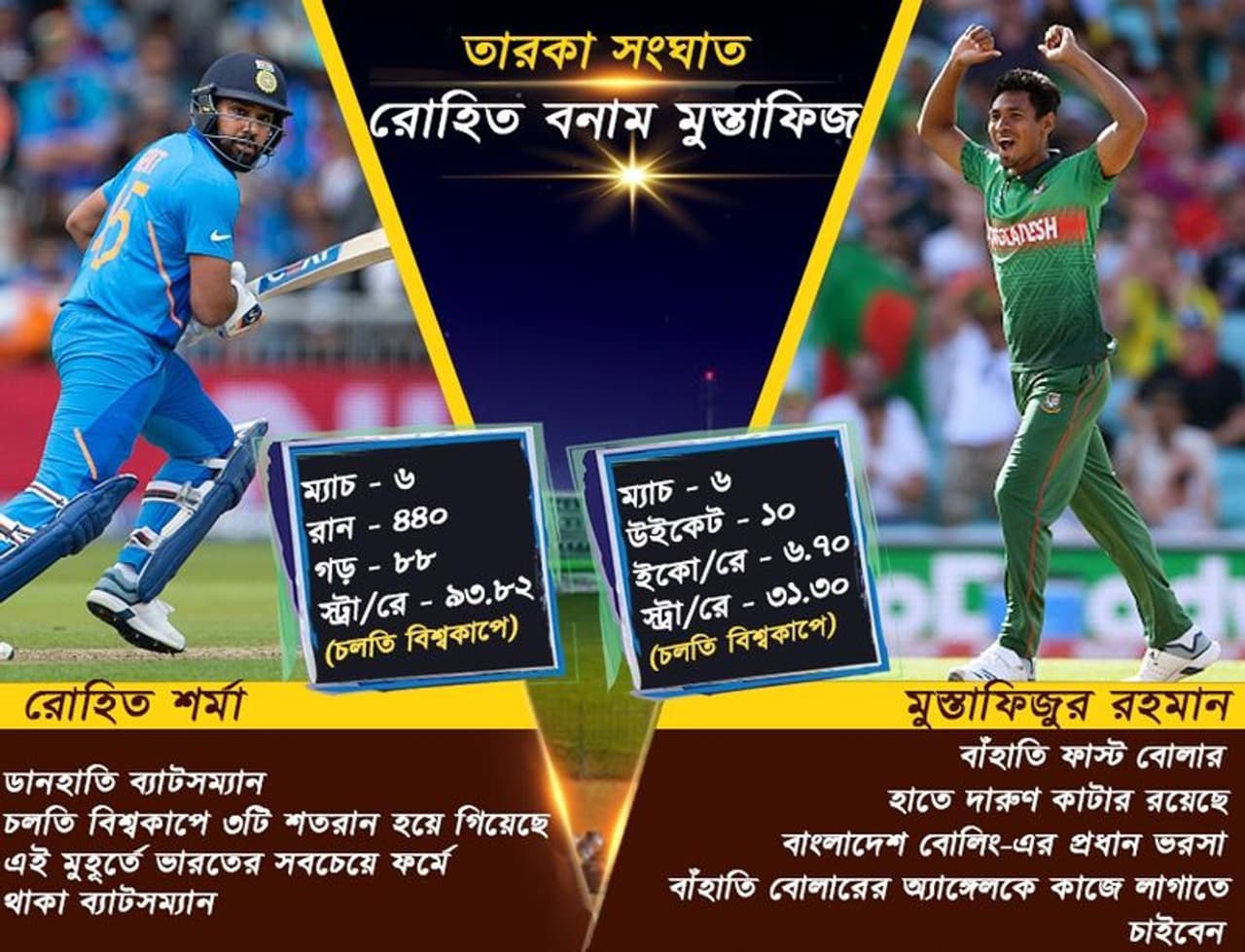 রোহিত শর্মা বনাম মুস্তাফিজুর রহমান - দারুণ ফর্মে আছেন রোহিত। তবে মুস্তাফিজুর রহমানের বাঁহাতি কাটারের সামনে আগেও বিপদে পড়েছেন, এইদিনও নতুন বলে পাওয়ারপ্লের ওভারে তাঁকে খেলতে সমস্য়ায় পড়তে পারেন।