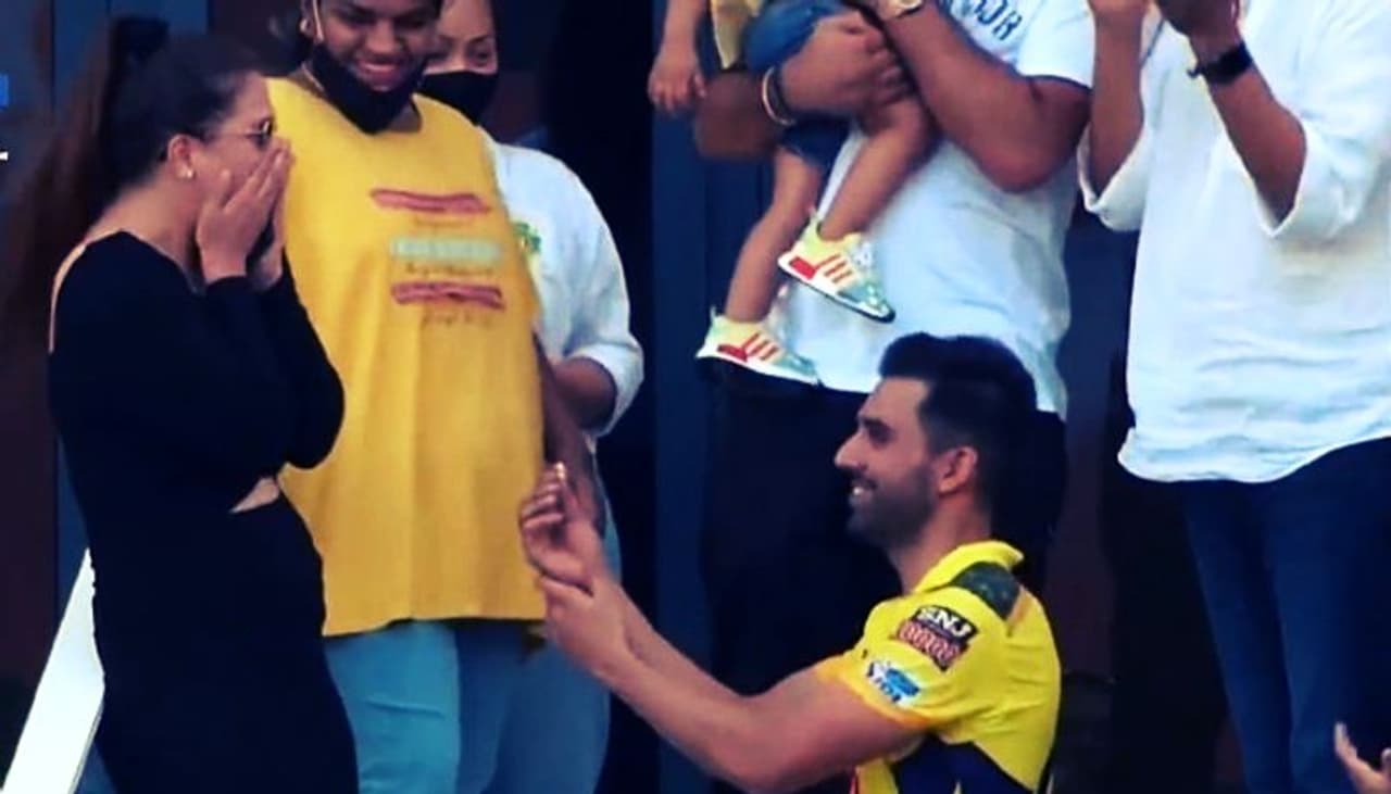 মাঠে দিনটা খুবই খারাপ গেলেও, বৃহস্পতিবার ম্যাচ শেষে গ্যালারি মাতিয়ে দেন সিএসকে-র জোরে বোলার। ম্যাচের শেষে সোজা গ্যালারিতে চলে যান দীপক। তারপর হাঁটু মুড়ে বসে আঙটি তুলে ধরেন প্রেমিকা জয়া ভরদ্বাজের সামনে।