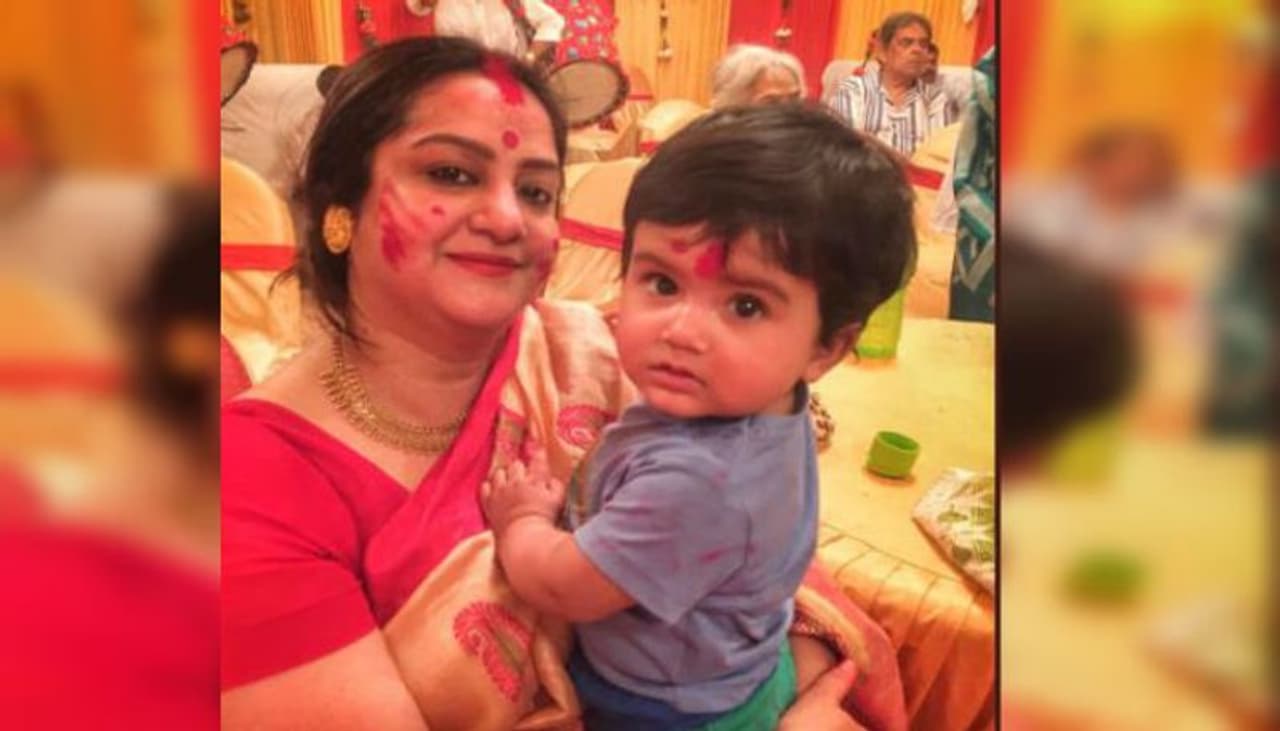 সুদীপার কোলে ছোট্ট আদিদেব, সিঁদুর মেখে একেবারে রেডি পোজ দেওয়ার জন্য।