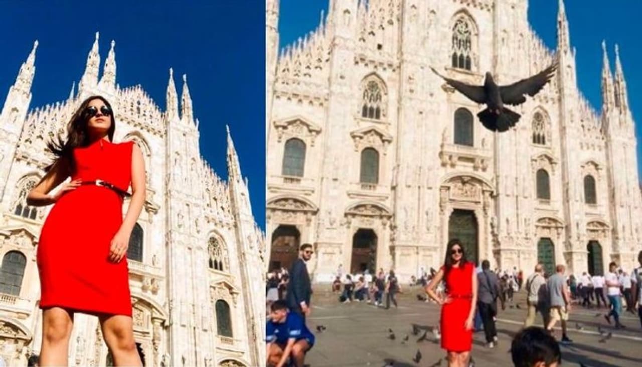 ইটালির মিলানে লাল ড্রেসে দর্শনা। আকাশের ঘন নীল রংয়ের সঙ্গে লাল রং মিশে একাকার।