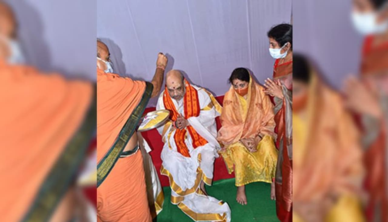 মন্দির দর্শনের পর অমিত শাহ ও তাঁর স্ত্রী সোনাল শাহ বেদ পন্ডিতদের আশীর্বাদ নেন। তাঁদের প্রসাদ দেওয়া হয় ও মন্দিরের স্মারক তাঁদের হাতে তুলে দেওয়া হয়।