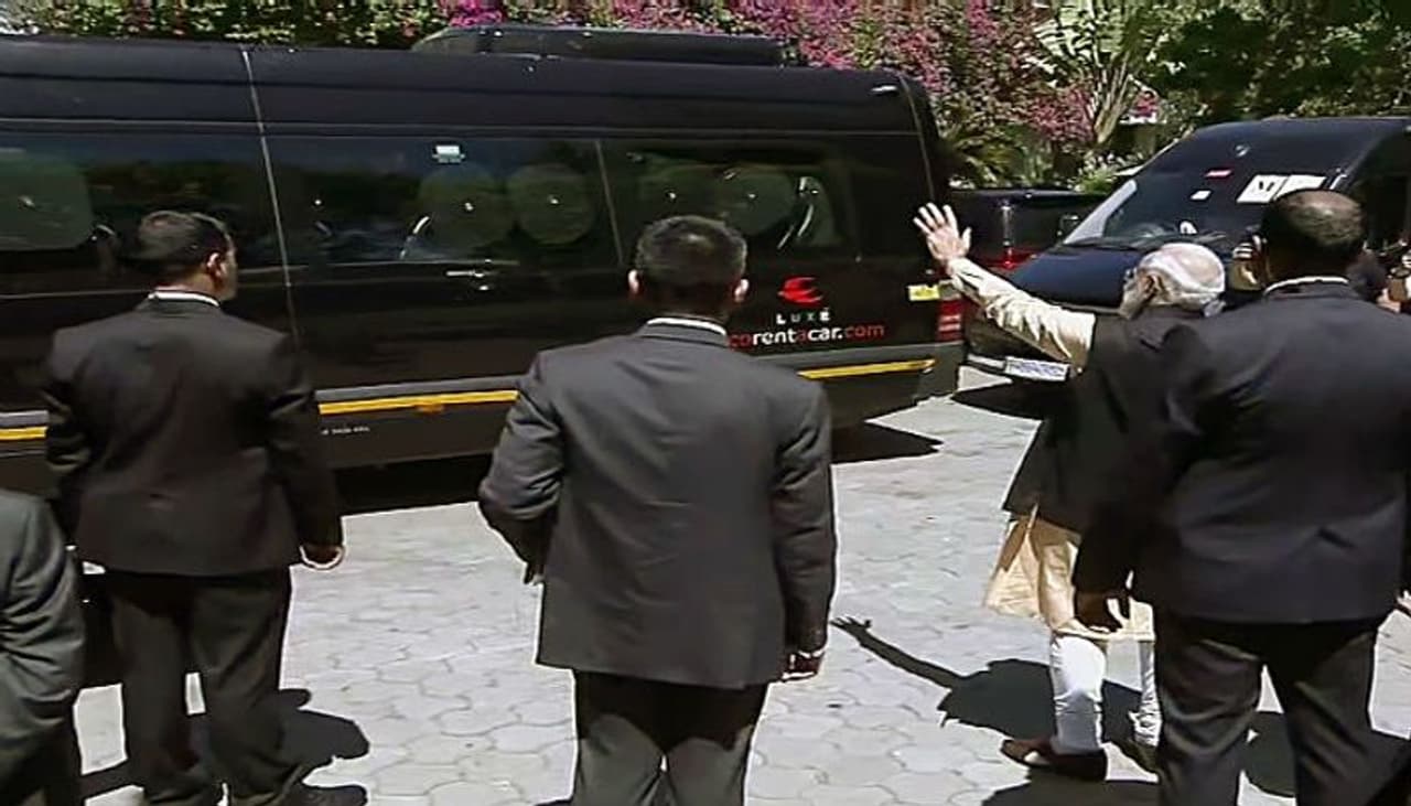 কোভালমের হোটেলে জিনপিং-কে স্বাগত জানাচ্ছেন মোদী।