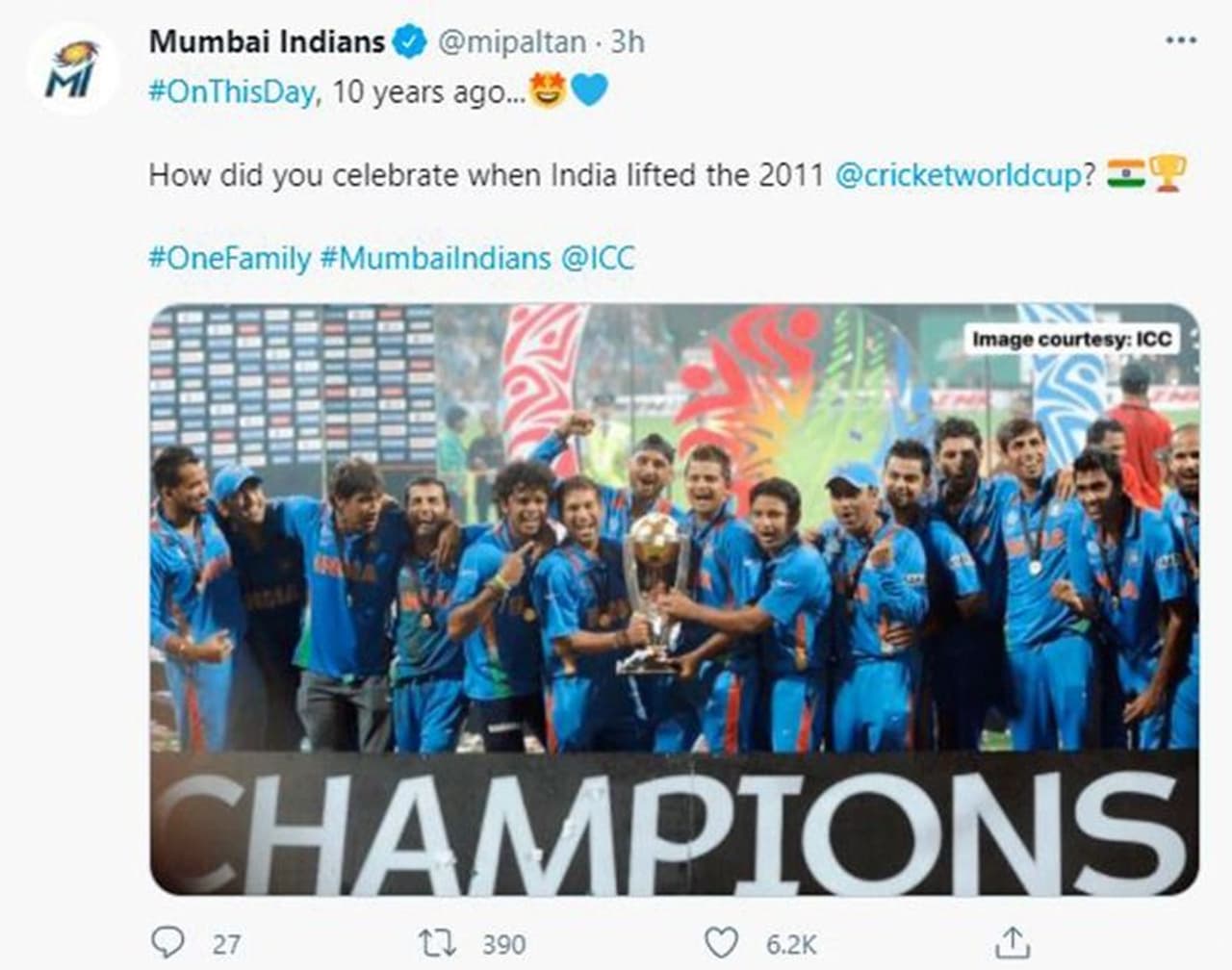 ৫ বারের আইপিএল চ্যাম্পিয়ন দল মুম্বই ইন্ডিয়ান্স ভারতের বিশ্বকাপ জয়ের ১০ বছর পূর্তিতে সোশ্যাল মিডিয়ায় শুভেচ্ছা জানায়। একইসঙ্গে কে কীভাবে সেই দিন সেলিব্রেট করেছিল তাও জানতে চাওয়া হয়।