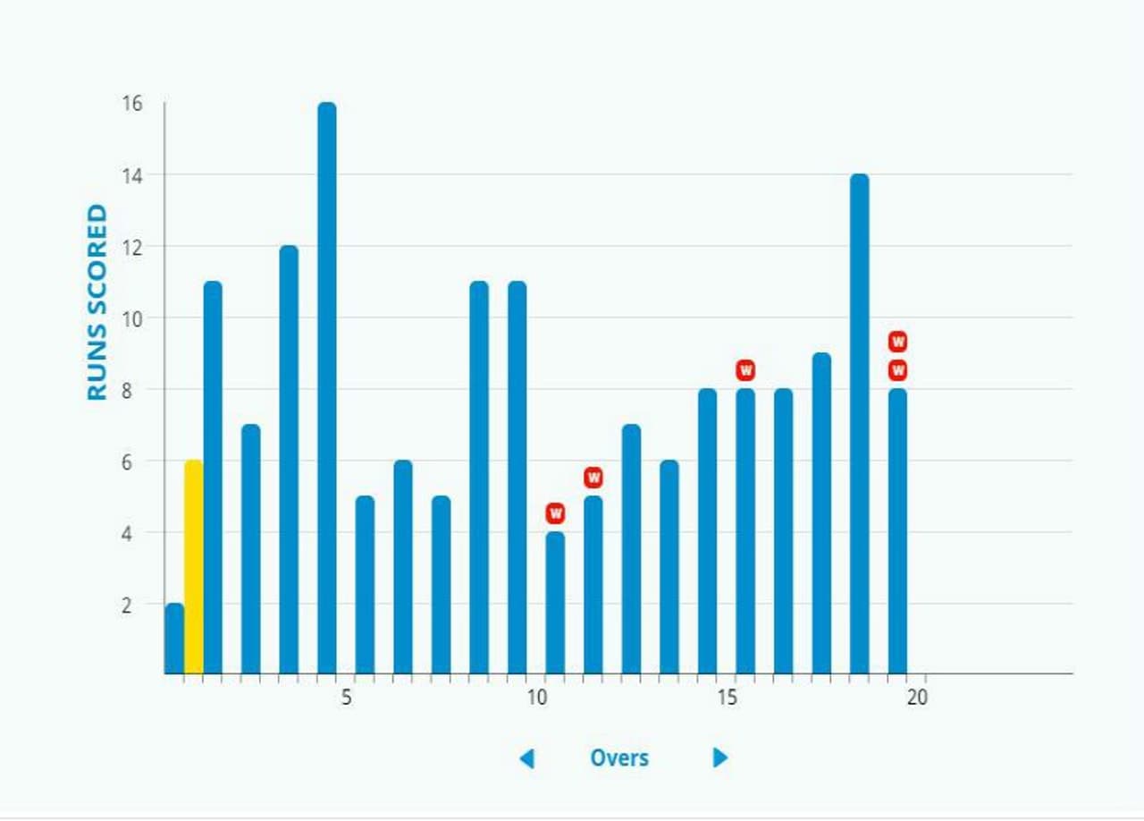 বার গ্রাফ দেখিয়ে দিচ্ছে কীভাবে রান ওঠার গতি বাড়িয়েছিল আরসিবি। আবার ১০ ওভার পরে যখন প্রথম উইকেটের পতন হয় তখন কীভাবে রান তোলার গতি মন্থর হয়েছিল। তবে ১৭ থেকে ১৯ ওভারের মধ্যে ডিভিলিয়ার্সের ব্যাটের মারকুটে মেজাজ যে আরসিবি-র রানের গতিকে বাড়িয়ে দেয় তাও ফুটে উঠেছে এই বার গ্রাফে।