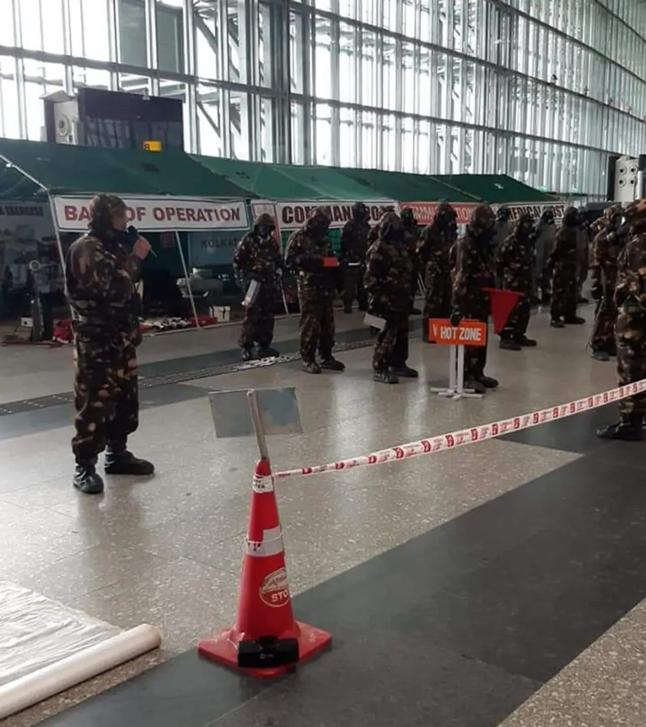 জাতীয় দুর্যোগ প্রতিক্রিয়া বাহিনী, ভারত, কেন্দ্রীয় শিল্প সুরক্ষা বাহিনী - সিআইএসএফ, দমকল বিভাগ, বিধাননগর পুলিশ ও বিমানবন্দর কর্মকর্তারা এই মহড়ায় অংশ নিয়েছিলেন। পরীক্ষার করা জন্য আনা হয় বিশালাকার বড় বড় ট্রে।