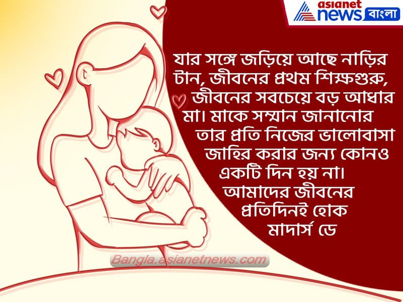যার সঙ্গে জড়িয়ে আছে নাড়ির টান, জীবনের প্রথম শিক্ষগুরু, জীবনের সবচেয়ে বড় আধার মা। মাকে সম্মান জানানোর তার প্রতি নিজের ভালোবাসা জাহির করার জন্য কোনও একটি দিন হয় না। আমাদের জীবনের প্রতিদিনই হোক মাদার্স ডে।– মাতৃ দিবসে পাঠাতে পারেন এমন বার্তা। নানা দেশের পুরাণেও মাতৃ দিবসের উল্লেখ আছে। মাতৃ দিবসের আধুনিক উদযাপন শুরু হয় ১৯০০ সাল থেকে।