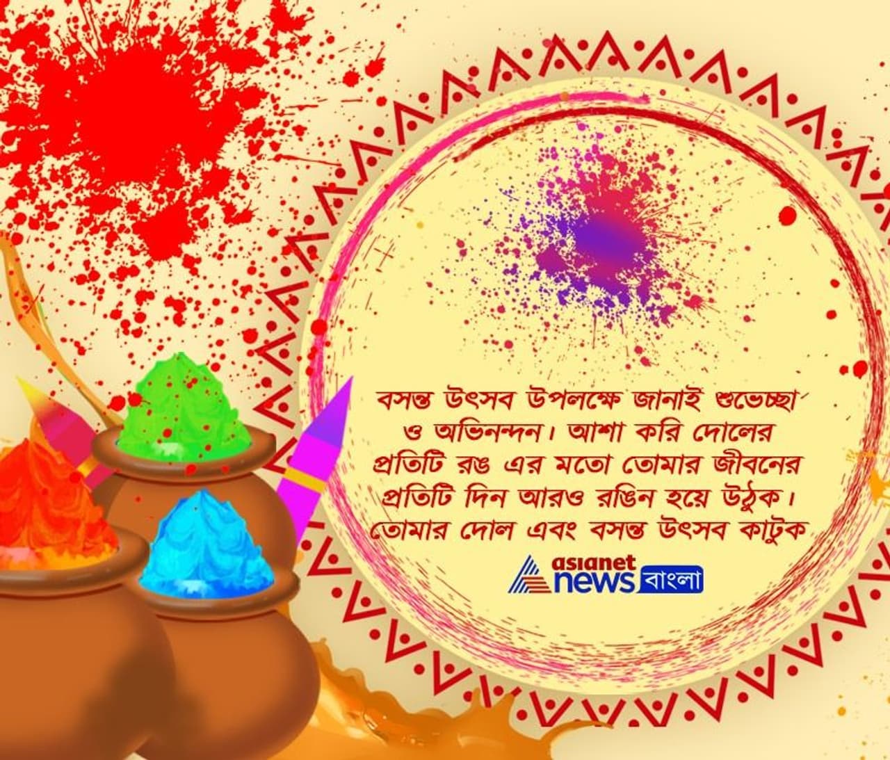দোল উৎসবের অনেক শুভেচ্ছা। সমস্ত কিছু ভুলে আজে রঙের আনন্দে মেতে ওঠো। তোমার জীবন হয়ে উঠুক অনেক রঙীন। শুভ দোল উৎসব।