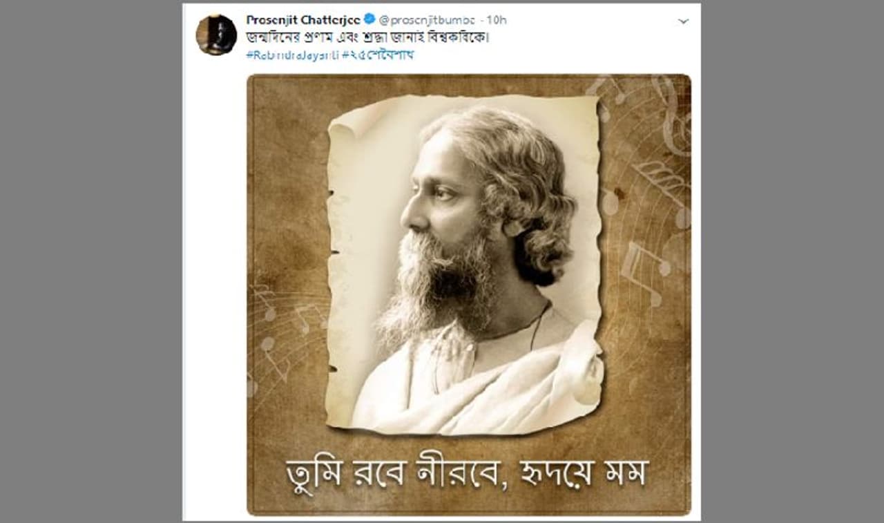 রবীন্দ্রনাথ ঠাকুরের জন্মদিন উপলক্ষে টুইট করে শ্রদ্ধার্ঘ্য জনালেন অভিনেতা প্রসেনজিৎ চট্টোপাধ্যায়।
