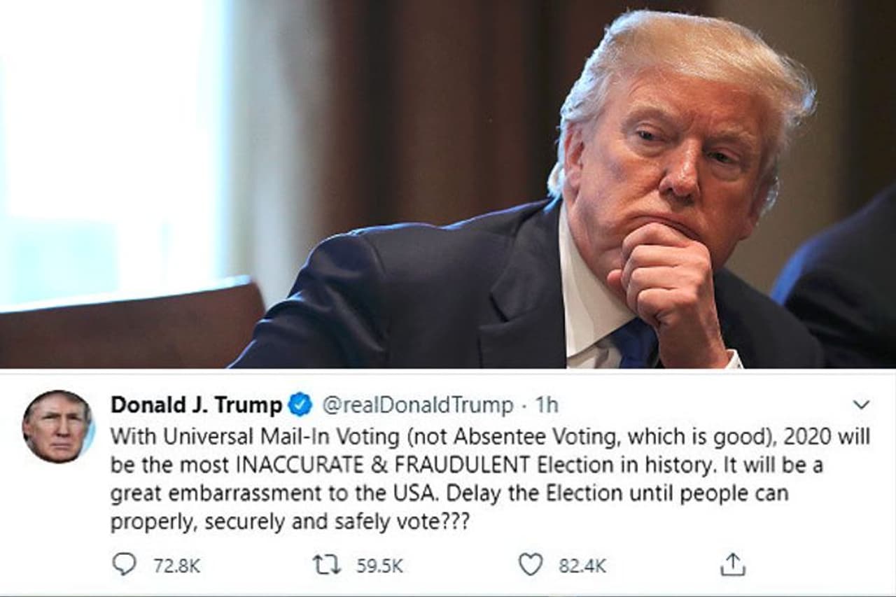 এদিন একটি টুইট করে মেল-ইন ভোটদানে জালিয়াতি হতে পারে এমন আশঙ্কা প্রকাশ করেছেন তিনি। তিনি বলেন ইউনিভার্সাল মেল-ইন ভোটিং-এ নির্বাচন হলে ২০২০ সালের নির্বাচনই মার্কিন প্রেসিডেন্ট নির্বাচনের ইতিহাসে সবচেয়ে ত্রুটিপূর্ণ এবং প্রতারণাপূর্ণ নির্বাচন হবে। তাতে বেজায় বিব্রতকর অবস্থায় পড়তে হবে বিশ্বের সবচেয়ে প্রাচীন গণতন্ত্রকে। কাজেই যতদিন না পর্যন্ত মার্কিন জনতা যথাযথভাবে, সুরক্ষিতভাবে ও নিরাপদে ভোট দিতে না পারছেন ততদিন পর্যন্ত ভোটগ্রহণ পিছিয়ে দেওয়া উচিত বলে মত দিয়েছেন মার্কিন প্রেসিডেন্ট।
