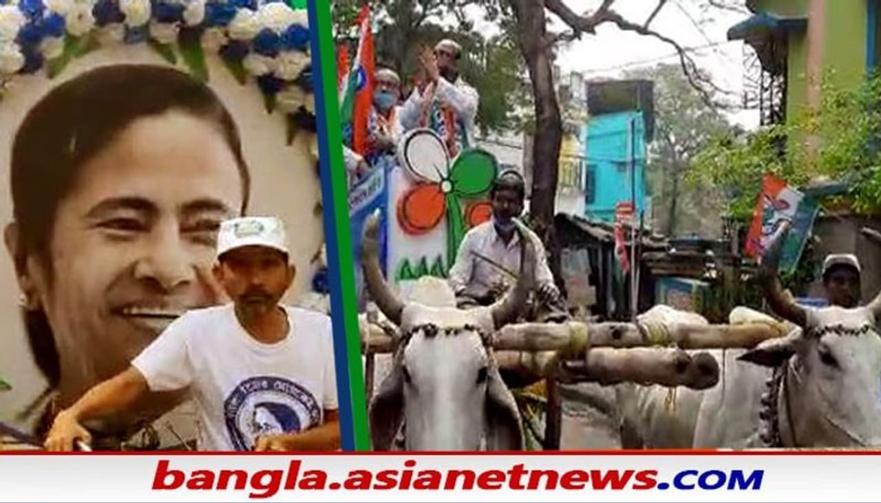 অন্যান্য প্রার্থীদের মতো পায়ে হেঁটে বাঁ হুড খোলা গাড়িতে প্রচার না করে, গরুর গাড়ি সাজিয়ে প্রচারে নামলেন তিনি।