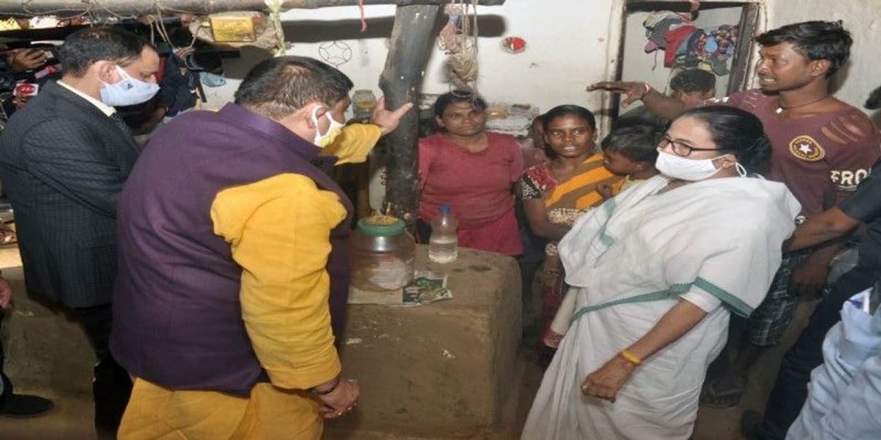 ৪ কিলোমিটার পদযাত্রা করে অমিত শাহকে জবাব দেওয়ার পর মঙ্গলবার বোলপুরেই ছিলেন মুখ্যমন্ত্রী। এদিন রাতে আমারকুঠি বনবাংলোতে রাত্রিযাপন করেন। এরপর, বুধবার সকালে সেখান থেকে বেরিয়ে সটান চলে যান বল্লভপুরডাঙা গ্রামে। সেখানে অধিকাংশ আদিবাসী পরিবারের বাস।