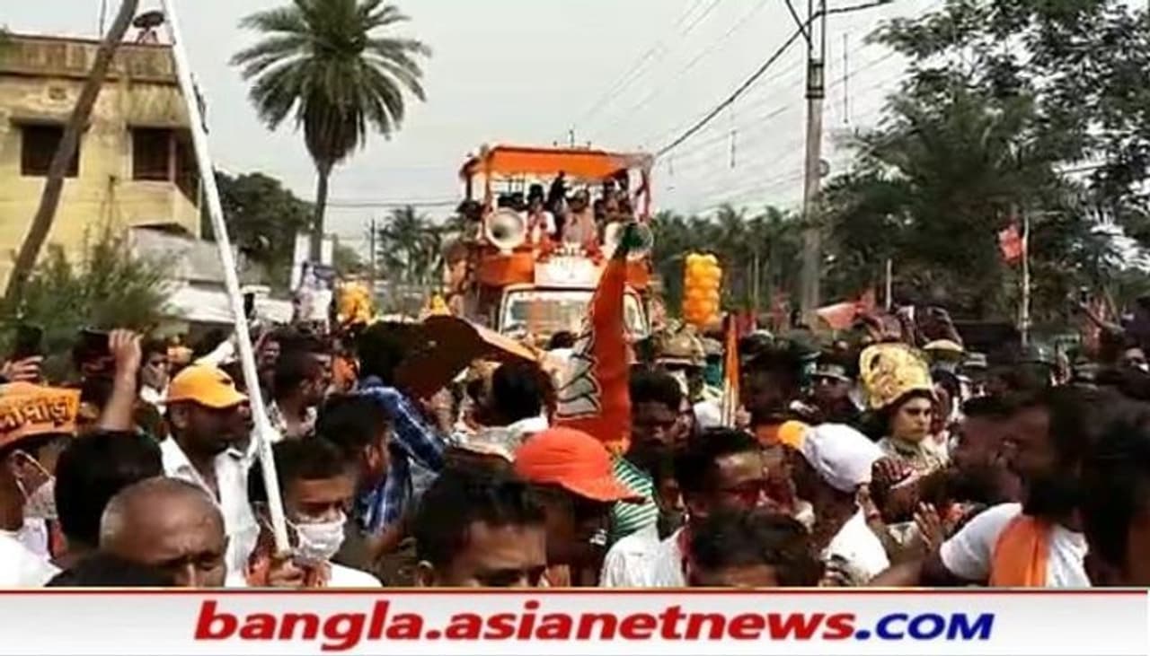 বর্ণাঢ্য শোভাযাত্রা সঙ্গে পায়ে পা মেলান বিজেপি কর্মী সমর্থক রা। এদিন মিঠুন চক্রবর্তী কে দেখতে রাস্তার দু'পাশে মানুষের ঢল নামে।