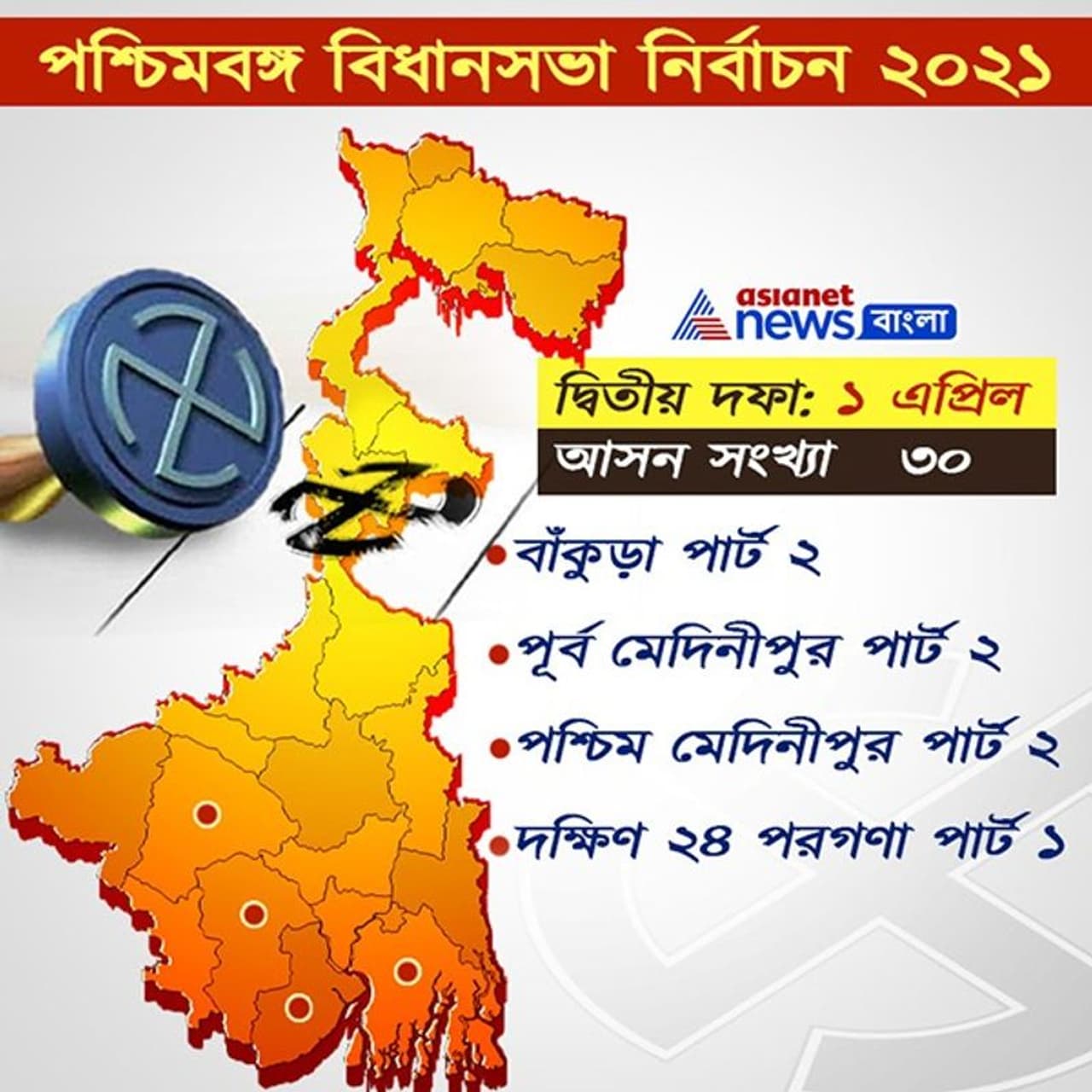 দ্বিতীয় দফায় রাজ্যের চারটি জেলার তিরিটি আসনে ভোট গ্রহণ হবে। দক্ষিণ ২৪ পরগনার চারটি আসনে ভোট গ্রহণ হবে। পূর্ব মেদিনীপুরের ও পশ্চিম মেদিনীপুরের ৯ এবং বাঁকুড়ার আটটি কেন্দ্রে ভোট গ্রহণ হবে। ১৭১ জন প্রার্থীর ভাগ্য পরীক্ষা হবে।