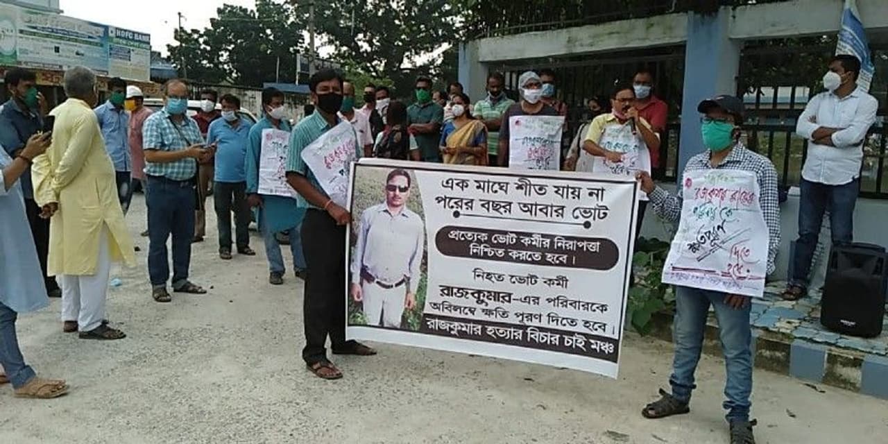 কিন্তু ভোট চলাকালীন যে প্রিসাইডিং অফিসার মারা গেলেন, তাঁর পরিবারকে এখনও পর্যন্ত কোনও আর্থিক সাহায্য করেনি নির্বাচন কমিশন। সঠিক তদন্তের দাবিতে 'রাজকুমার রায়ের হত্যার বিচার চাই' নামে একটি অরাজনৈতিক মঞ্চ গড়েছে প্রয়াত শিক্ষকের সহকর্মীরা। সেই মঞ্চের তরফে সোমবার অবস্থান বিক্ষোভ চলল জেলাশাসকের দপ্তরের সামনে।