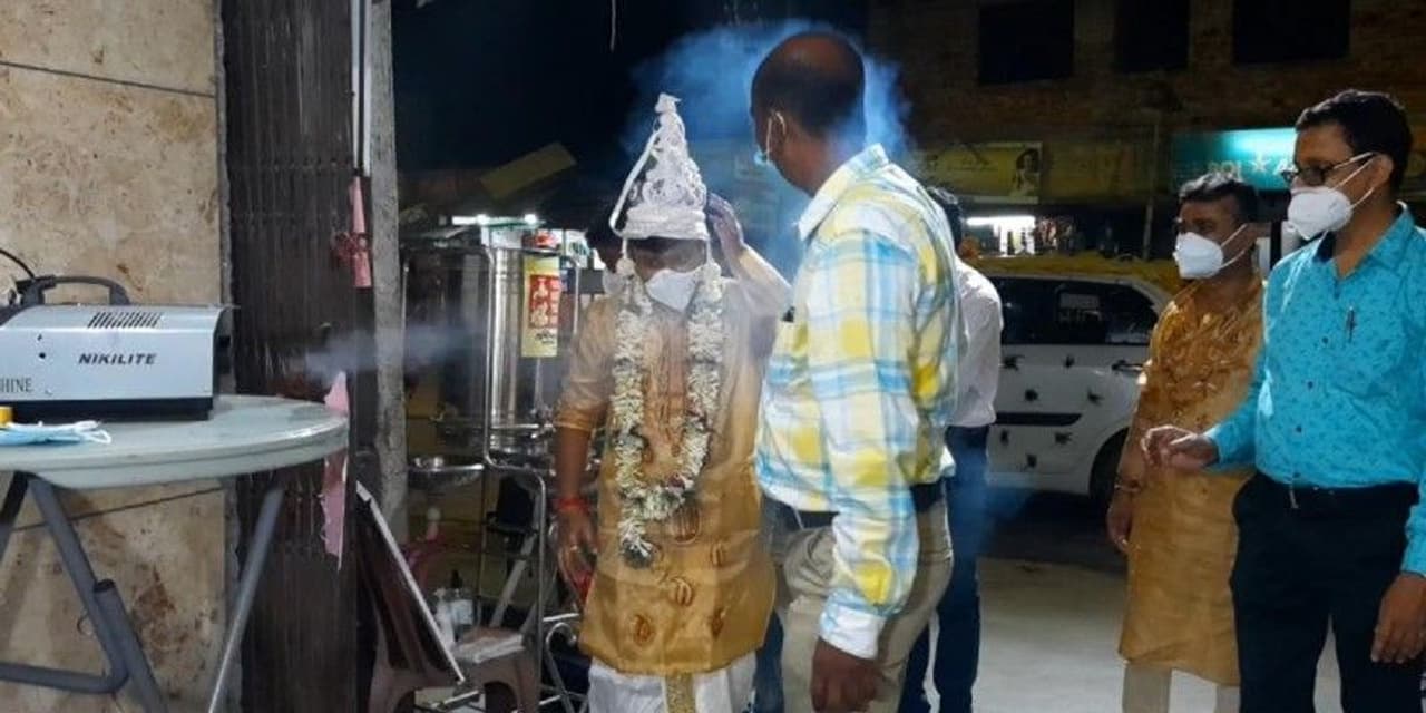 বিয়ের সাজে কনের মুখেও ছিল ফেস শিল্ড। মাস্ক পরেই মন্ত্রোচারণ করলেন পুরোহিত। এমনকী, নিয়ন্ত্রিতদের ভোজপর্বও চলল দুই দফায়।