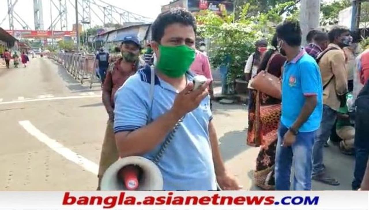কোভিডে ভয়াবহ অবস্থার জেরে রবিবার থেকে কার্যত লকডাউন বাংলায়। হাওড়া ব্রিজের সামনে সাধারণ মানুষকে সতর্ক করতে চলছে মাইকিং।