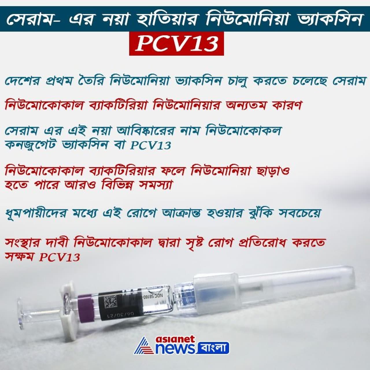 সেরাম ইনস্টিটিউট এর এই নয়া আবিষ্কার নিউমোকোকল কনজুগেট ভ্যাকসিন (PCV13)নিউমোকোকাল রোগ প্রতিরোধ করতে সক্ষম। এই নিউমোকোকাল ব্যাকটিরিয়া নিউমোনিয়ার অন্যতম কারণ এবং নিউমোনিয়া সহ বিভিন্ন ধরণের রোগ সৃষ্টিকারী ফুসফুসের সংক্রমণ ঘটায়। নিউমোকোকল রোগ নিউমোকোকাল ব্যাকটিরিয়া দ্বারা সৃষ্ট যে কোনও অসুস্থতায় কাজ করবে বলে দাবী করেছে সংস্থা।