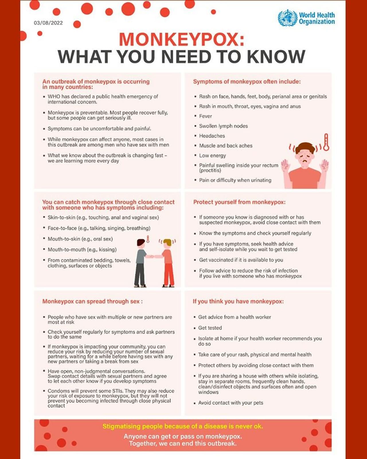 করোনার পর মাঙ্কিপক্সের সংক্রমণ চিন্তার ভাঁজ ফেলেছে চিকিৎসকদের কপালে। বহুদিন ধরে ঘটে চলেছে মাঙ্কি পক্সের সংক্রমণ। এই রোগ থেকে বাঁচতে বারে বারে সতর্ক করা হচ্ছে সাধারণ মানুষকে। এবার জনসাধারণকে সতর্ক করতে বিশেষ বার্তা দেওয়া হল WHO এর পক্ষ থেকে। সোশ্যাল মিডিয়ায় একটি বিশেষ বার্তা প্রকাশ করা হচ্ছে বিশ্ব স্বাস্থ্য সংস্থার পক্ষ থেকে। জেনে নিন এই রোগ থেকে বাঁচতে কী করবেন।