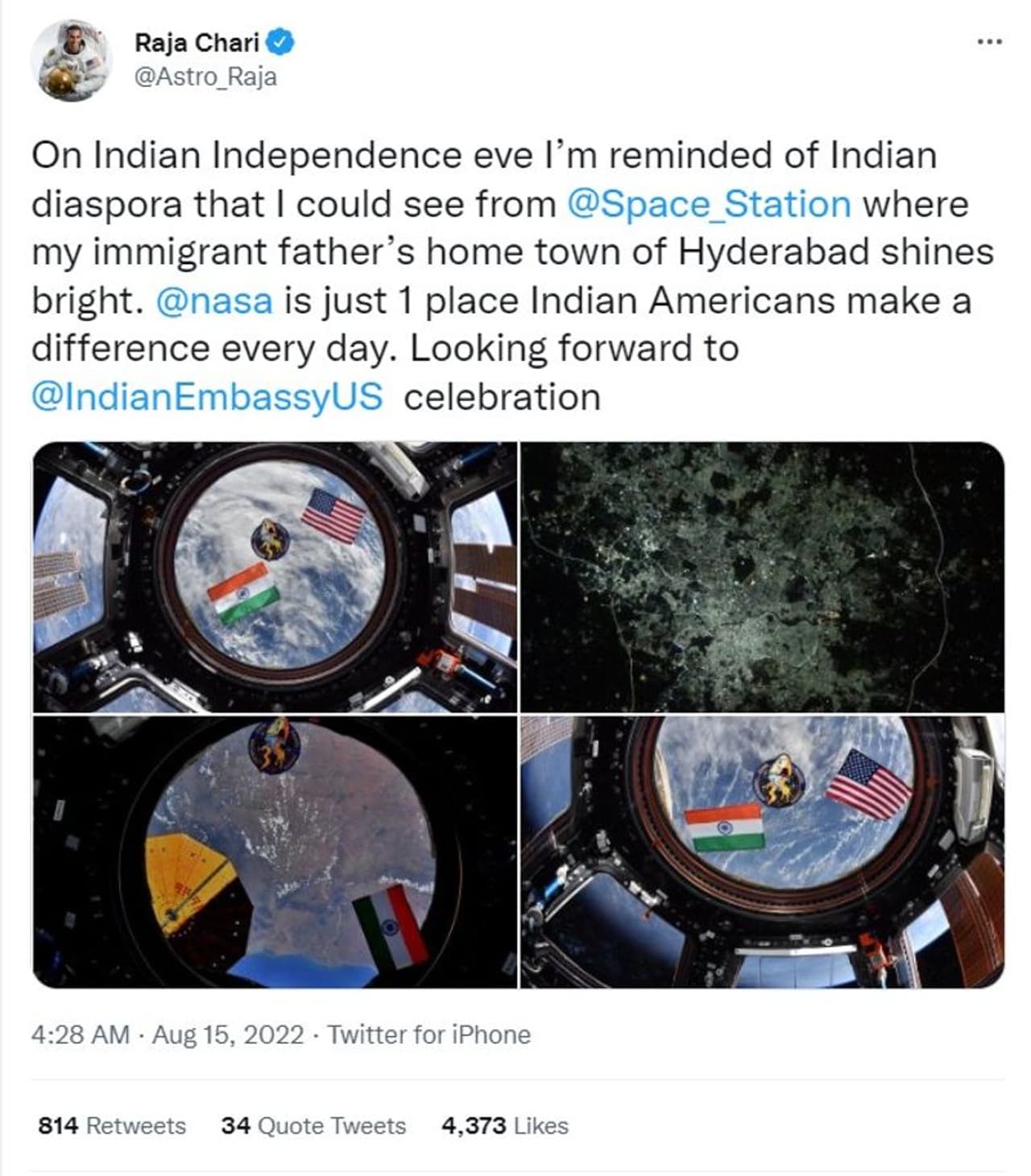 নাসার মহাকাশচারী রাজা চারি, যিনি সম্প্রতি আন্তর্জাতিক মহাকাশ স্টেশনে ছয় মাসের মিশনের পরে দেশে ফিরেছেন, ভারতকে স্বাধীনতার ৭৫ বছর উপলক্ষে অভিনন্দন জানিয়েছেন এবং বলেছেন যে নাসা এবং ভারতীয় মহাকাশ গবেষণা সংস্থা (ইসরো) দীর্ঘ সহযোগিতা করেছে । ভারতের সঙ্গে একসঙ্গে কাজ কাজ করার জন্য তিনি উন্মুখ।