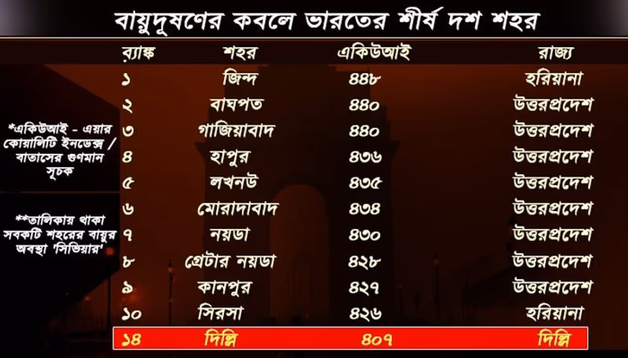 গত তিনদিনে ভারতের বায়ু দূষণের জন্য কুখ্যাত ৯৭ টি শহরের বায়ুর গুণমান সূচকের তথ্য বিশ্লেষণ করে দেখা গিয়েছে সবচেয়ে বিষাক্ত অবস্থা হরিয়ানা জিন্দ শহরের। গত তিনদিনে দিল্লির গড় একিউআই যেখানে ছিল ৪০৭, সেখানে এই শহরের গড় একিউআই ছিল ৪৪৮।
