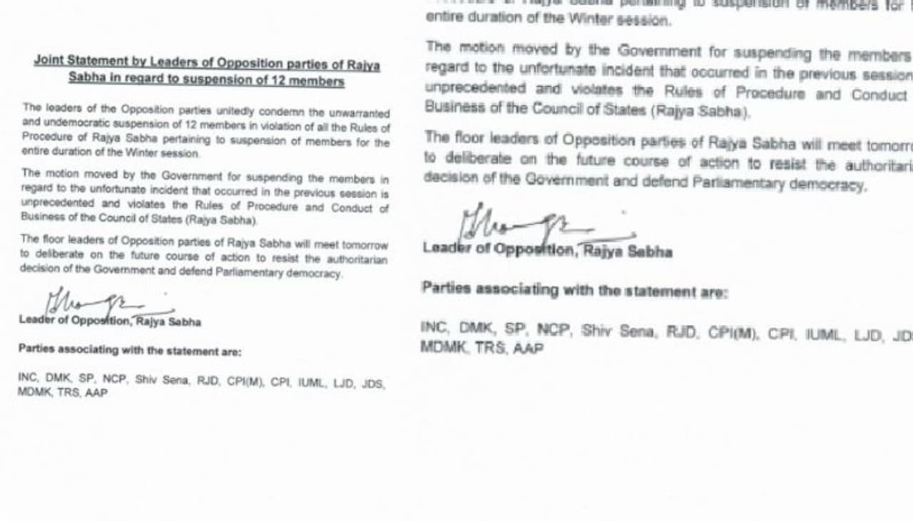 সংসদের শীতকালীন অধিবেশেনর (Parliament Winter Session) প্রথম দিনেই রীতিমত উত্তাল ছিল রাজ্যসভা (Rajya Sabha)। রাজ্যসভার ইতিহাসে এই প্রথম একসঙ্গে ১২জন সাংসদকে সাসপেন্ড (12 MPs suspended) করা হয়েছে। পেগাসাস ইস্যুতে বিক্ষোভ দেখোয় বিরোধী রাজনৈতিক দলের সাংসদরা। ঐক্যবদ্ধভাবেই আন্দোলন দেখায় বিরোধী দলের সাংসদরা। তাতেই ১২ জন সাংসদকে সাসপেন্ড করা হয়। কিন্তু বিরোধী ঐক্য চুরমার হয়ে যায় বিরোধীদলগুলির জারি করা বিবৃতিতেত (Join Statement)। বিরোধীদের জয়েন্ট স্টেটমেন্টে নাম নেই তৃণমূল কংগ্রেসের (TMC)। যৌথ বিবৃতিতে নাম রয়েছে কংগ্রেস, ডিএমকে, সমাজবাদী পার্টি, এনসিপি, শিবসেনা, আরজেডি, সিপিআই, সিপিএম, আম আজদমি পার্টি, টিআরএস, এলজেডি, জেডিএস, এমডিএমকে, আইইউএমএর। কিন্তু নাম নেই তৃণমূল কংগ্রেসের। তারপরই জাতীয় রাজধানীর রাজনৈতিক মহলের প্রশ্ন বিরোধীরা কী যৌথ বিবৃতির মাধ্যমে পাশ কাটিয়ে গেল তৃণমূল কংগ্রেসকে।