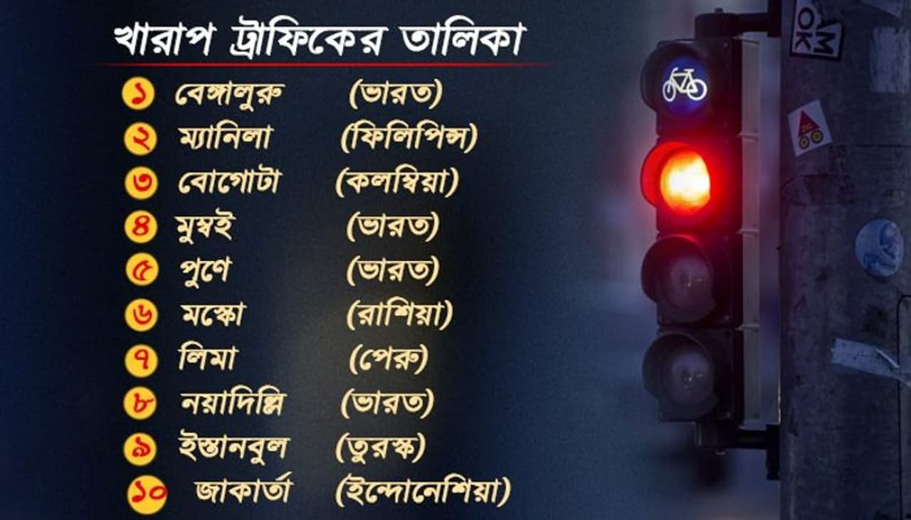 বিশ্বের সবচেয়ে খারাপ ট্রাফিক বেঙ্গালুরুর তালিকায় ১০টি শহরের মধ্যে ৪টি ভারতের খারাপ ট্রাফিকের তালিকায় রয়েছে মুম্বই ও পুণে রাজধানী দিল্লি স্থান পেয়েছে অষ্টম স্থানে