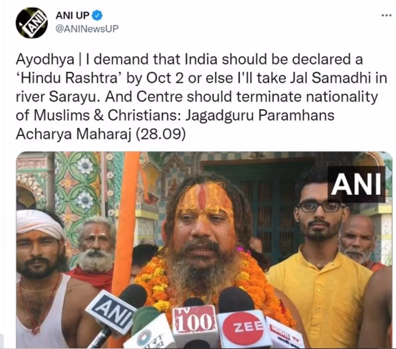 বুধবার সংবাদ মাধ্যমের মুখোমুখি হন জগৎগুরু (Saint) পরমহংস আচার্য মহারাজ এবং সেখানেই এই চাঞ্চল্যকর দাবি তুলে ধরেন তিনি। তাঁর মতে, "২ অক্টোবরের মধ্য ভারতবর্ষকে হিন্দু রাষ্ট্র হিসেবে ঘোষণা করার দাবি জানাচ্ছি। তা না হলে আমি সরযূ নদীতে জল সমাধি গ্রহণ করব"। একইসঙ্গে তিনি আরও বলেন যে কেবল দেশকে হিন্দু রাষ্ট্র হিসাবে ঘোষণা করার পাশাপাশি ইতিমধ্যে কেন্দ্রের উচিত ভারতবর্ষ থেকে মুসলিম (Muslim) ও খ্রিষ্টান (Christian) সম্প্রদায়ের মানুষের নাগরিকত্ব বাতিল করে দেওয়া।
