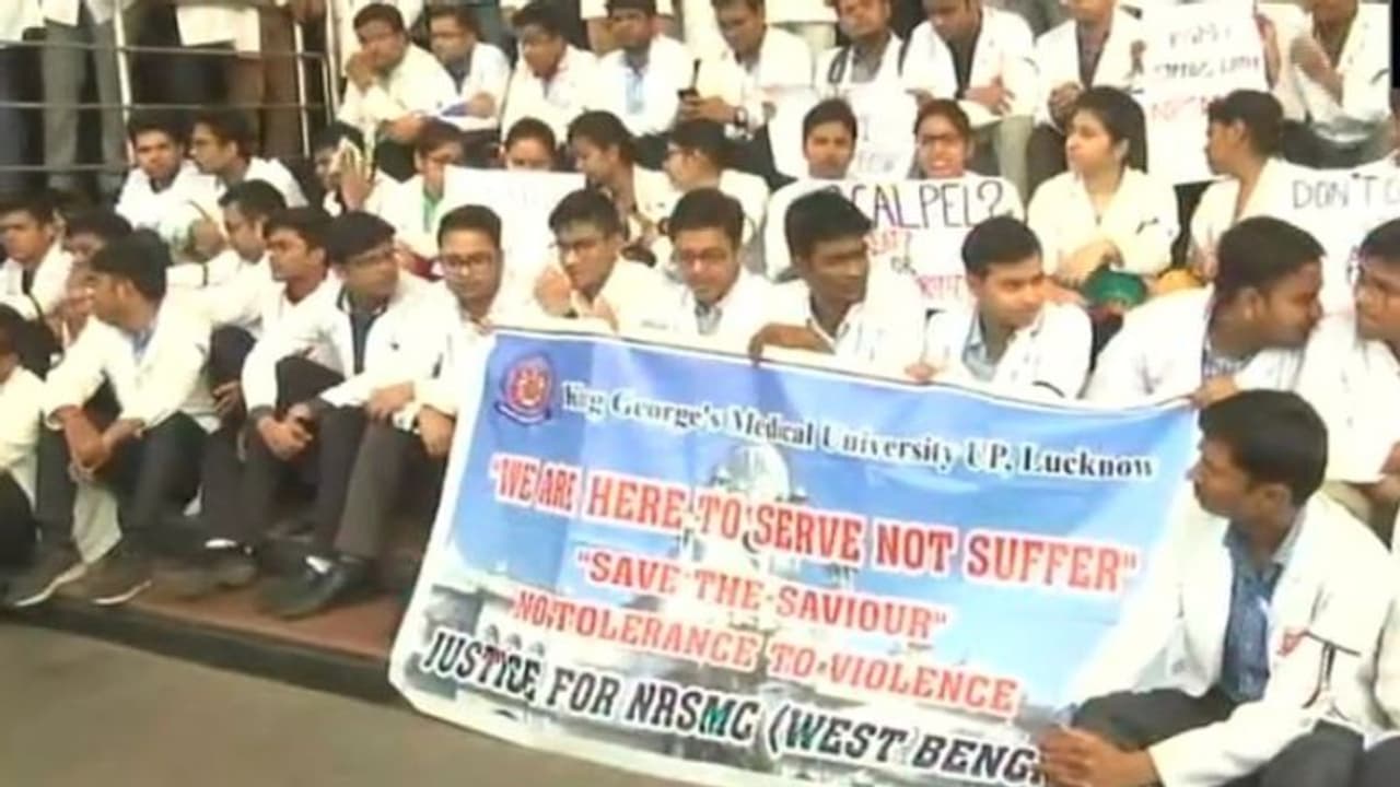 লখনউ-এও ধরা পড়েছে ধর্মঘটের সেই ছবি যেখানে কিং জর্জেস মেডিকেল ইউনিভার্সিটির চিকিৎসকরা সমবেতভাবে পালন করছেন ধর্মঘট।