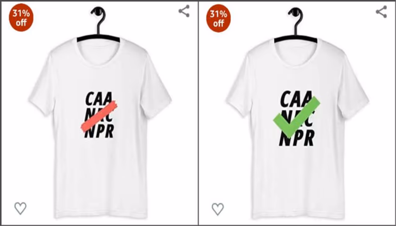 একমাসের উপর নাগরিকত্ব আইন নিয়ে বিতর্ক চলছে। অনেকেই নানান সৃষ্টিশীল ভাবে সিএএ আইনের বিরোধিতা করছেন। এবার অ্যামাজনে বিক্রি শুরু হল সিএএ বিরোধী টিশার্ট। আবার সিএএ সমর্থক টিশার্টও পাওয়া যাচ্ছে একই জায়গায়।