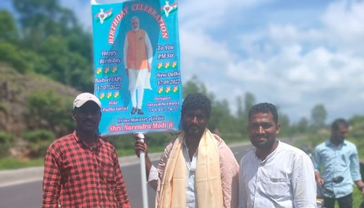 প্রধানমন্ত্রী নরেন্দ্র মোদীর জন্মদিন আসছে। আগামী সেপ্টেম্বর মাসের ১৭ তারিখে তাঁর জন্মদিন। আর এই বিশেষ দিনটিতে তাঁকে শুভেচ্ছা জানাতে অভিনব উদ্যোগ নিয়েছেন অন্ধ্র প্রদেশের বাসিন্দা নরসীমা। প্রায় ২ হাজার কিলোমিটার হেঁটে দিল্লি গিয়ে তিনি জন্মদিনের শুভেচ্ছা জানাবেন প্রধানমন্ত্রী মোদীকে।