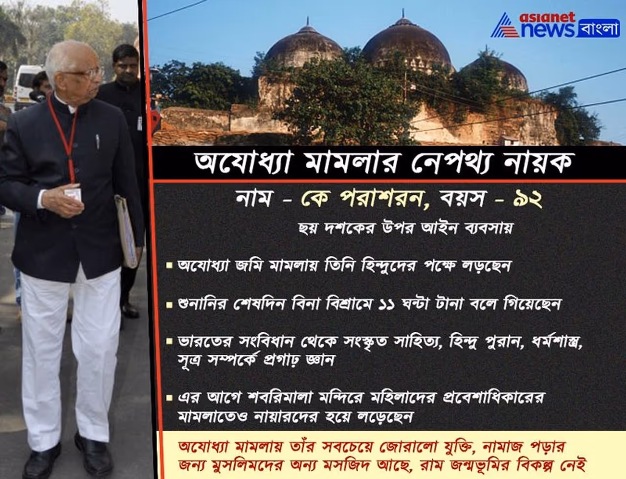 শনিবার অযোধ্যা মামার রায় ঘোষণা করেছে সুপ্রিম কোর্ট অযোধ্যার বিতর্কিত জমিটি হিন্দু পক্ষ পেলেও মুসলিম পক্ষকেও বিকল্প জমি দেওয়া হয়েছে এই রায়ে হিন্দু পক্ষের প্রধান আইনজীবী কে পরাশরনই মান্যতা পেয়েছেন বলে মনে করা হচ্ছে ৯২ বছরের এই আইনজীবী একটি যুক্তিতেই কিস্তিমাত করেছেন
