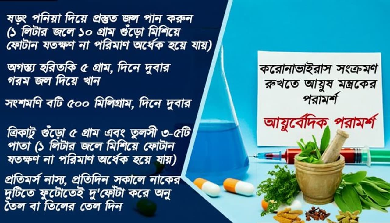 মন্ত্রকের পক্ষ থেকে অবশ্য প্রথমেই স্বীকার করা হয়েছে এটি করোনভাইরাস সংক্রমণের চিকিত্সা নির্দেশিকা নয়। তবে সংক্রমণ যাতে না ঘটে তার জন্য প্রতিরোধমূলক ব্যবস্থার উপদেশ। ষড়ঙ্গা পনিয়া মিশিয়ে জলপান, অগস্ত্য হরিতকী খাওয়া, সমশমণি বটি, ত্রিকাটু গুঁড়ো এবং তুলসী পাতার কাথ পান, প্রতিদিন নাকের ফুটোয় দু'ফোঁটা করে তিলের তেল দেওয়ার মতো - পরামর্শ দেওয়া হয়েছে।
