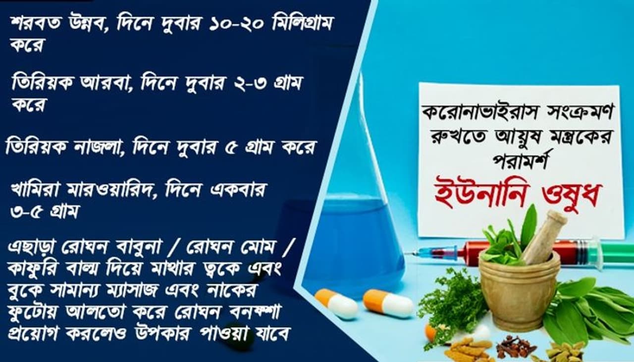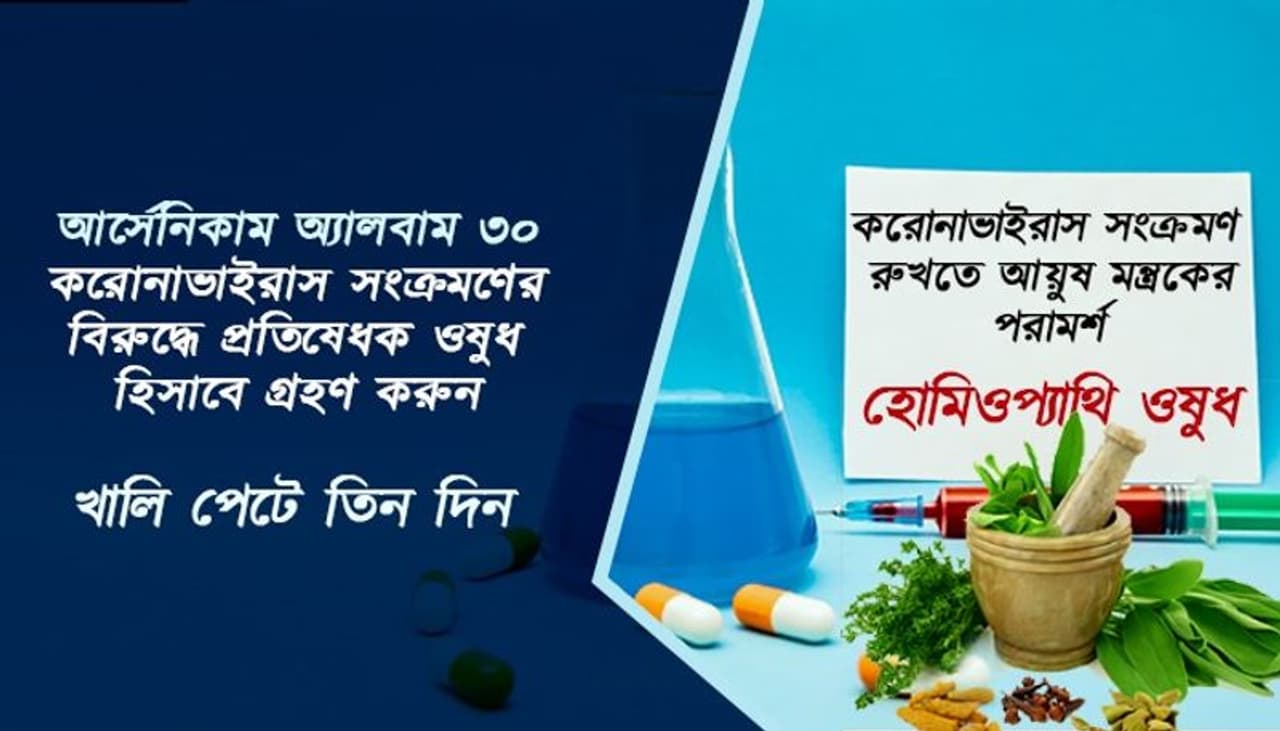 শুধু তাই নয়, কিছু সাধারণ হোমিওপ্যাথি ওষুধ ও ইউনানি ওষুধ ব্যবহারের পরামর্শও দেওয়া হয়েছে। হোমিওপ্যাথি কাউন্সিল-এর বৈজ্ঞানিক উপদেষ্টা বোর্ডের বৈঠকের পর সাধারণ ইনফ্লুয়েঞ্জার ওষুধ, আর্সেনিকাম অ্যালবাম ৩০ খেতে বলা হয়েছে করোনভাইরাস সংক্রমণ প্রতিরোধের জন্য। এছাড়া রোগের বিভিন্ন অস্বস্তি কাটাতে বেশ কয়েকটি ইউনানি ওষুধ খাওয়া ও মালিশ করার কথাও বলা হয়েছে।