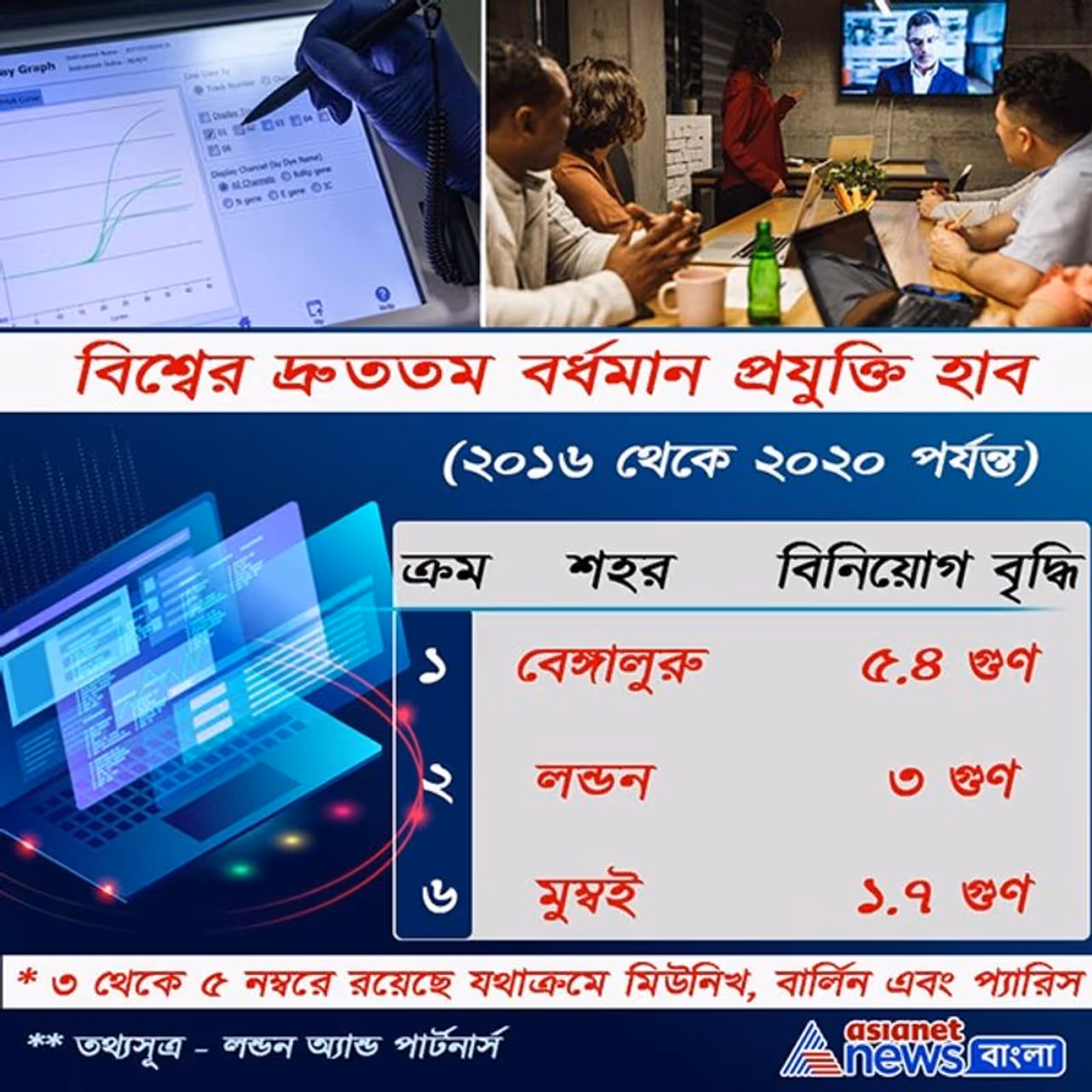 লন্ডনকে টপকে গেল বেঙ্গালুরুবিশ্বের সবথেকে দ্রুত বর্ধনশীল প্রযুক্তি হাব এখন এই শহর২০১৬ থেকে ২০২০ সালের মধ্যে বিনিয়োগ বেড়েছে ৫.৪ গুণতালিকায় ৬ নম্বরে রয়েছে মুম্বই