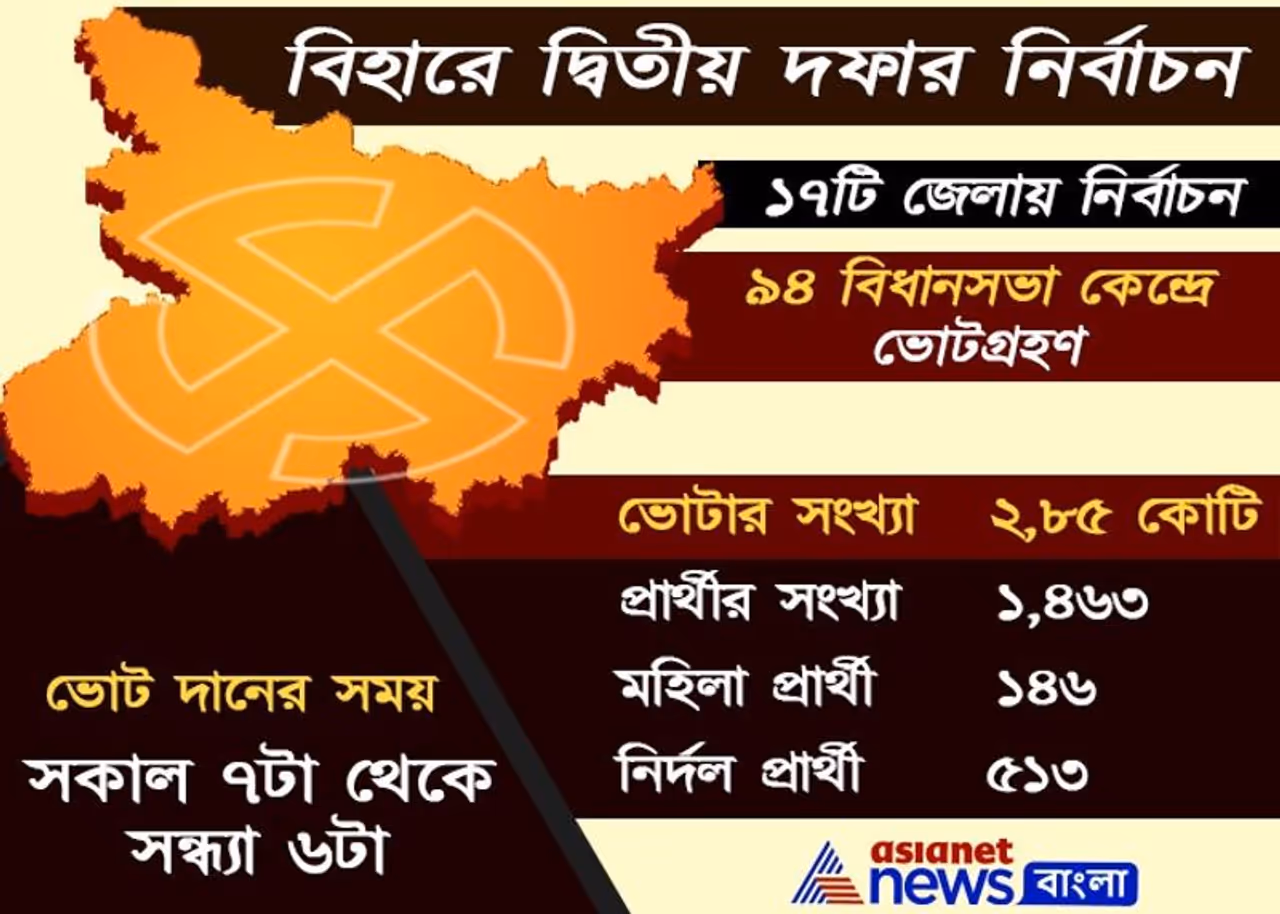 নীতিশ কুমার কি বারও মুখ্যমন্ত্রী হয়ে ফিরে আসবেন নাকি তেজস্বী যাদব বিহারের কনিষ্ঠতম মুখ্যমন্ত্রী হয়ে শপথ গ্রহণ করবেন? দ্বিতীয় দফার নির্বাচনে তা আরও স্পষ্ট হয়ে যাবে বলেই মনে করছেন রাজনৈতিক বিশেষজ্ঞরা। মঙ্গলবার অর্থাৎ ৩ নভেম্বর বিহার বিধানসভার দ্বিতীয় পর্যায়ের নির্বাচন। এই নির্বাচন অনুষ্ঠিত হবে ১৭টি জেলার ৯৪টি কেন্দ্রে। এবার এক ঝলকে দেখে নিন দ্বিতীয় দফার নির্বাচনের চালচিত্র।