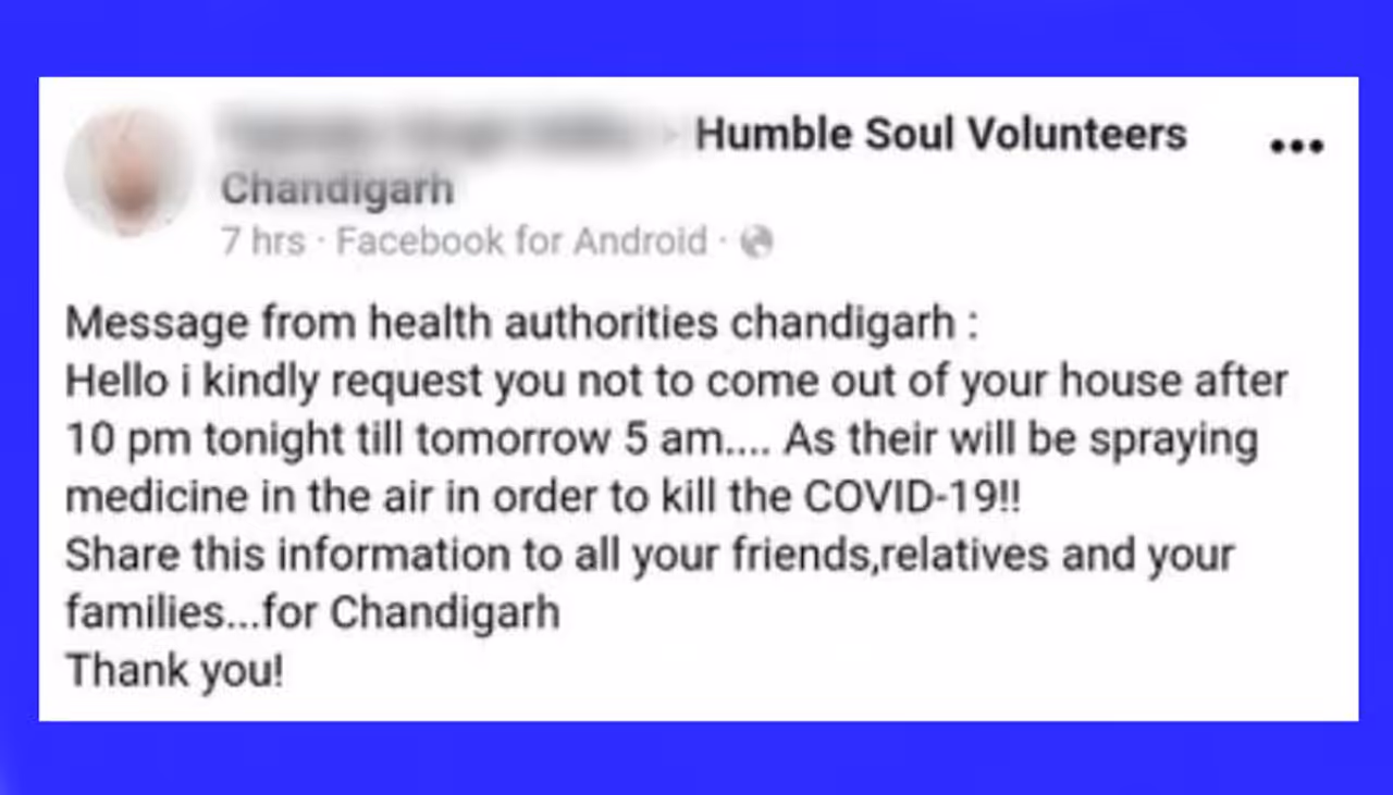 'বিনীতভাবে অনুরোধ করা হচ্ছে আজ রাত ১০টার পর থেকে আগামীকাল ভোর ৫টা অবধি বাড়ির বাইরে বের হবেন না। কারণ কোভিড-১৯ রোগকে মারতে বাতাসে ওষুধ স্প্রে করা হবে! আপনার সমস্ত বন্ধু, আত্মীয়স্বজন এবং আপনার পরিবারবর্গের কাছেও এই তথ্য শেয়ার করুন...ধন্যবাদ!' গত বুধবার এমনই একটি বার্তা চণ্ডীগড়ের অনেক বাসিন্দাই সোশ্যাল মিডিয়া মারফত পেয়েছিলেন। আতঙ্কে অনেকেই ঘর থেকে বের হননি। এরপর এমন বার্তা ছড়িয়েছিল বেঙ্গালুরুতেও। করোনাভাইরাস-এর প্রাদুর্ভাব ঠেকাতে যে যে জায়গায় লকডাউন প্রোটোকল জারি করা হচ্ছে সেখানে সেখানেই এই বার্তা ছড়িয়ে পড়ছে। তবে কি সত্যি সত্যিই সরকারের পক্ষ থেকে গোপনে রাতারাতি এই ভাইরাস মারার জন্য বাতাসে কোনও ওষুধ স্প্রে করা হচ্ছে?