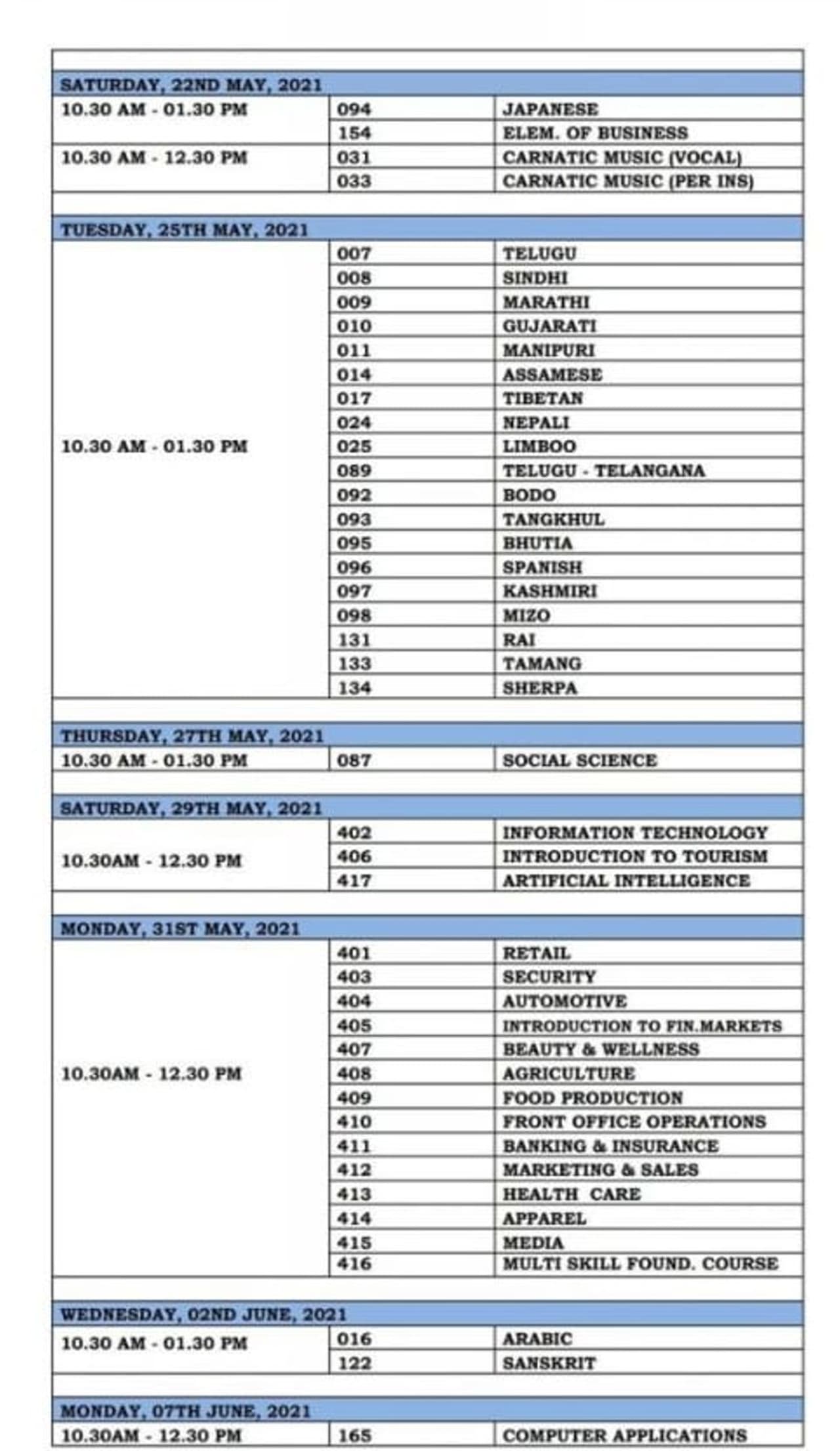 মহামারির কারণে বিশে দিন ধরে যাতে পরীক্ষা পর্ব না চলে সেই জন্য গুরুত্বপূর্ণ কর্মসূচি গ্রহণ করা হয়েছে। সিবিএসই-র পক্ষ থেকে জানান হয়েছে দুটি দফায় পরীক্ষা হবে। প্রথম দফায় সাধারণ পরীক্ষা নেওয়া হবে। দ্বিতীয় দফায় হবে বিদেশের স্কুলগুলির পড়ুয়ারা যেসব বিষয়গুলি নেননি সেগুলির পরীক্ষা। দশম শ্রেণির পরীক্ষা শেষ হচ্ছে ৭ জন। দ্বাদশ শ্রেণির পরীক্ষা শেষ হবে ১১ জুন। প্রথম শিফটের পরীক্ষা শুরু হবে সকাল সাড়ে দশটা থেকে। দ্বিতীয় শিফটের পরীক্ষা হবে দুপুর আড়াইটে থেকে।
