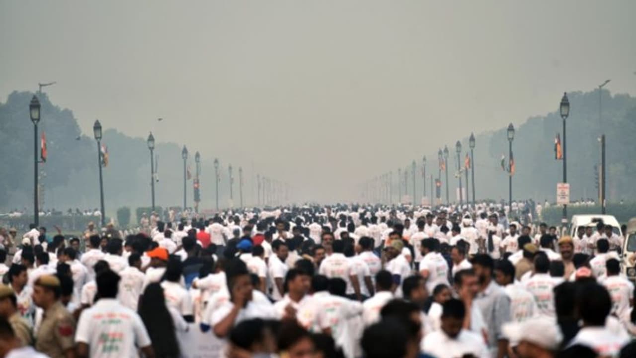 ধোঁয়ায় ঢেকেছে দিল্লি শহর। বাতাসের গুণমান নিয়ে গবেষণাকারী সংস্থা 'সফর ইন্ডিয়া' দিল্লিকে একেবারে লাল রঙে রাঙিয়ে দিয়ে বুঝিয়ে দিয়েছে কতটা খারাপ অবস্থা দিল্লির বায়ুমণ্ডলের। পরিবেশ ও আবহাওয়া গবেষকরা সতর্ক করছেন, এই পরিস্থিতিতে বাইরে না বের হওয়াই ভাল। হাঁটা বা দৌড় তো নৈব নৈব চ। কিন্তু তারপরেও বৃহস্পতিবার সরকারের 'ঐক্যের জন্য দৌড়' কর্মসূচিতে ওই ধোঁয়ায় ঢাকা শহরের মধ্য দিয়েই কয়েকশ' শিশু-সহ কয়েক হাজার দিল্লিবাসীকে দৌড় করানো হল।