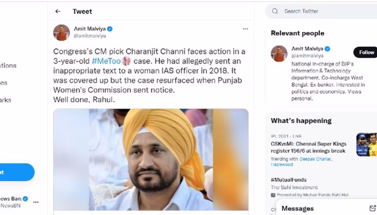 সোশ্যাল মিডিয়ায় বার্তা দিয়ে বিজেপি নেতা অমিত মালব্য বলেন, কংগ্রেস পঞ্জাবের মুখ্যমন্ত্রী হিসেবে এমন এক জনকে বেছেছে যাঁর বিরুদ্ধে তিন বছর আগে মি টু (Me Too)অভিযোগ রয়েছে। এই আইএএস (IAS) মহিলা আধিকারিককে টেক্সট ম্যাসেজের মাধ্যমে অশালীন মন্তব্য করেছিলেন বলে অভিযোগ রয়েছে। পঞ্জাবের মহিলা কমিশনেরও দৃষ্টি আকর্ষণ করা হয়েছিল বিষয়টি নিয়ে। এখানেই থেকে থাকেননি অমিত মালব্য। তিনি তারপরই কটুক্তির ছবি রাহুল গান্ধীকে বাহবা দেন।