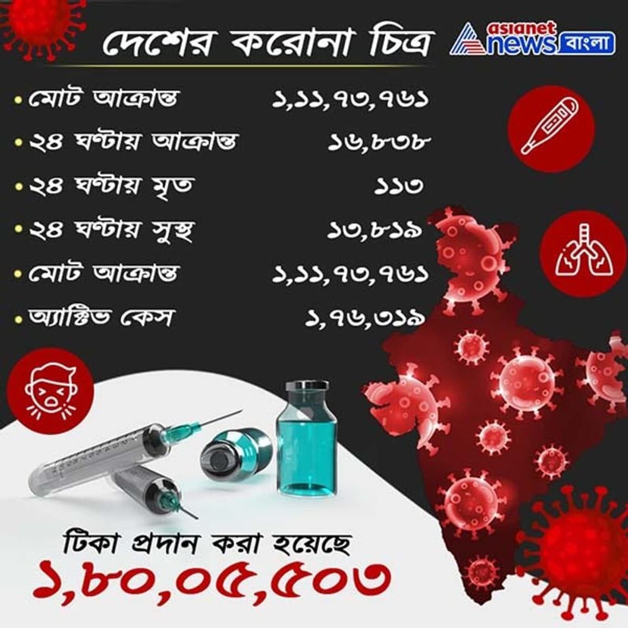 স্বাস্থ্য মন্ত্রকের দেওয়া তথ্য অনুযায়ী বর্তমানে দেশে অ্যাক্টিভ কেসের সংখ্যা ১ লক্ষ ৭৬ হাজারের বেশি। যা গতকালের তুলনায় ২.৯০৬ বেশি। দৈনিক আক্রান্তের সংখ্যায় প্রথমে রয়েছে মহারাষ্ট্র। দ্বিতীয় স্থানে কেরল। তৃতীয় স্থানে রয়েছে পঞ্জাব