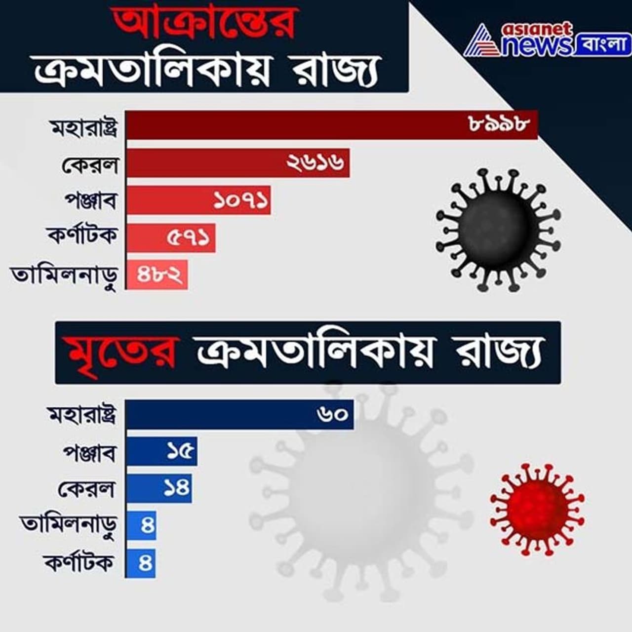 কেন্দ্রীয় স্বাস্থ্য মন্ত্রকের তথ্য অনুযায়ী আক্রান্ত ও সুস্থ হয়ে যাওয়া এই দুটি তালিকায় প্রথম ও দ্বিতীয় স্থানে রয়েছে মহারাষ্ট্র ও কেরল। অ্যাক্টিভকেসের তালিকায় দ্বিতীয় স্থানে রয়েছে পঞ্জব। তৃতীয় স্থানে রয়েছে কর্ণাটাক ও পঞ্চম স্থানে রয়েছে তামিলনাড়ু। আর সুস্থ হয়ে যাওয়া রাজ্যগুলির তালিকায় পঞ্চম স্থানে রয়েছে পঞ্জাব।